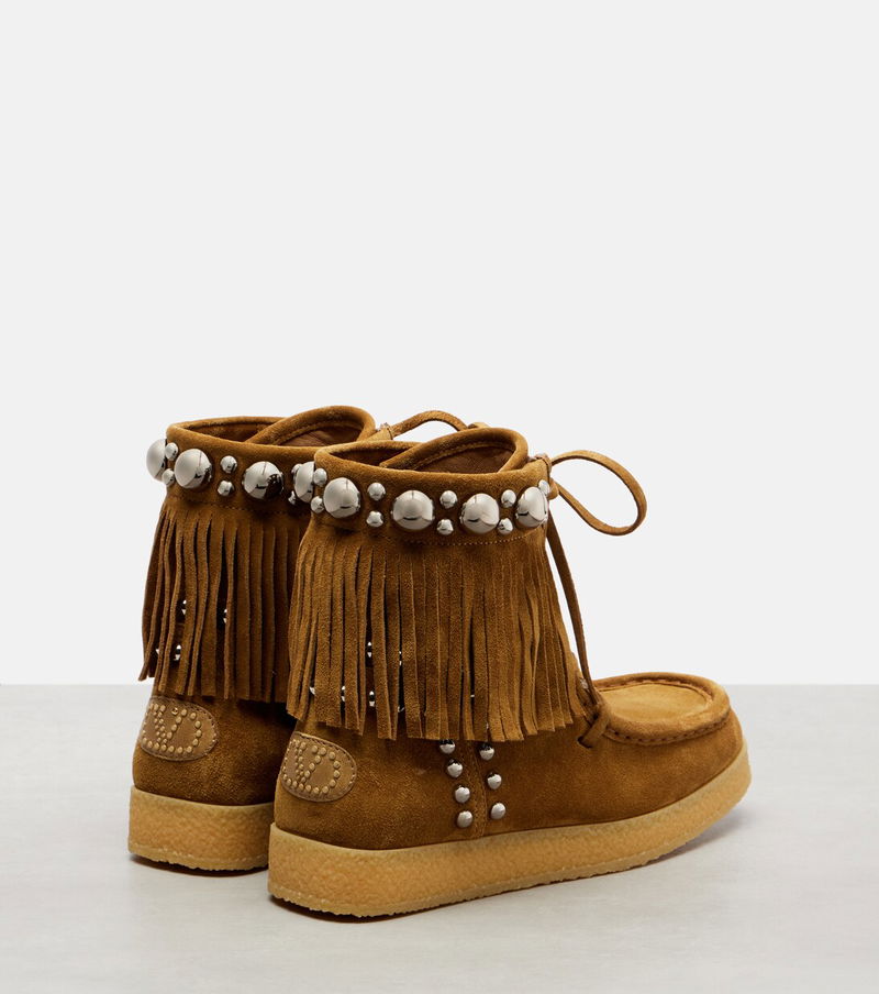The Nellcôte ankle boots from Valentino Garavani are made in Italy from supple suede. The lace-up design showcases stud embellishments around the upper and along the silhouette, and is complete with playful fringed detailing.