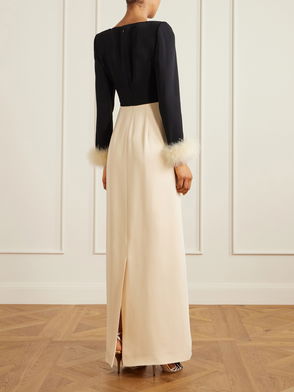 Invest in this elegant black dress—it’s one to wear over and again, Gown, Silk-voile, Frayed trims, Lace trims, Open back, Halterneck, Draped panel, Ties at back, Detachable slip to line, Lightweight, non-stretchy fabric.