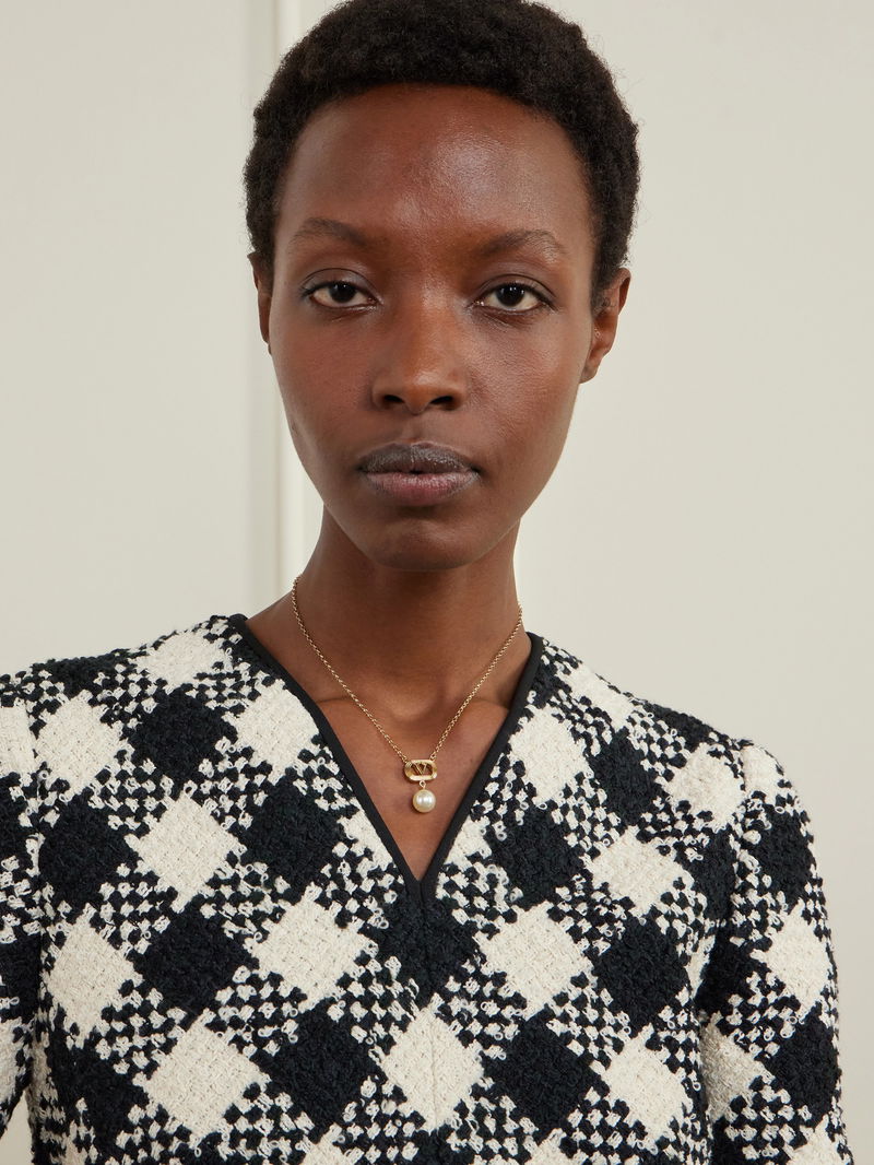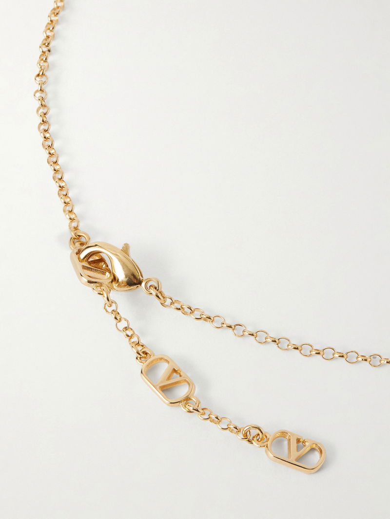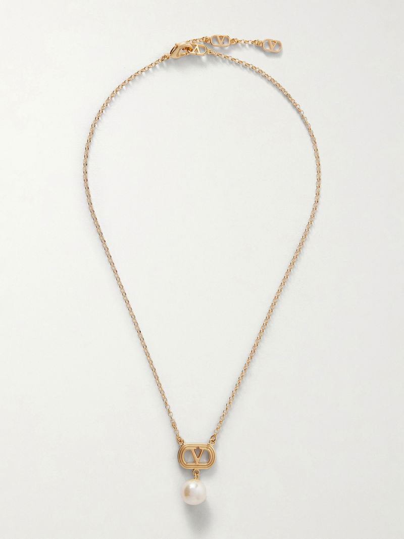 Valentino Garavani's necklace is made from gold-tone brass with a dainty chain. It's strung with the iconic 'VLogo' pendant and has a lustrous Swarovski faux pearl droplet – it rests elegantly on your décolletage.