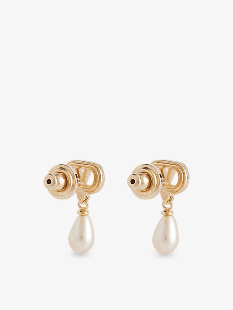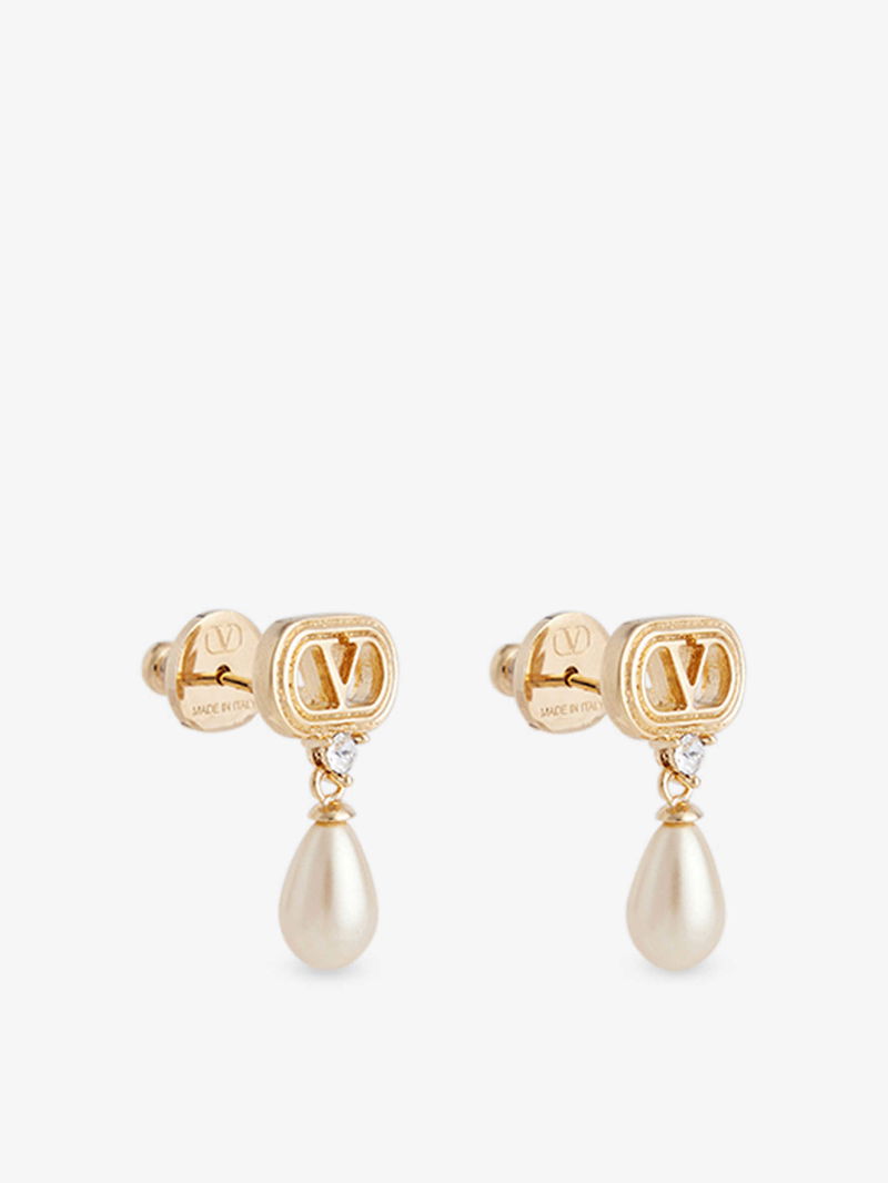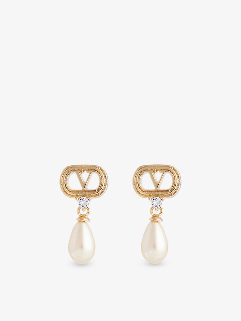 Valentino metal drop earrings. Swarovski® pearl and crystal. Post-back fastening. Oval shape, logo design, gold-tone finish, Swarovski® pearl and crystal droplet.