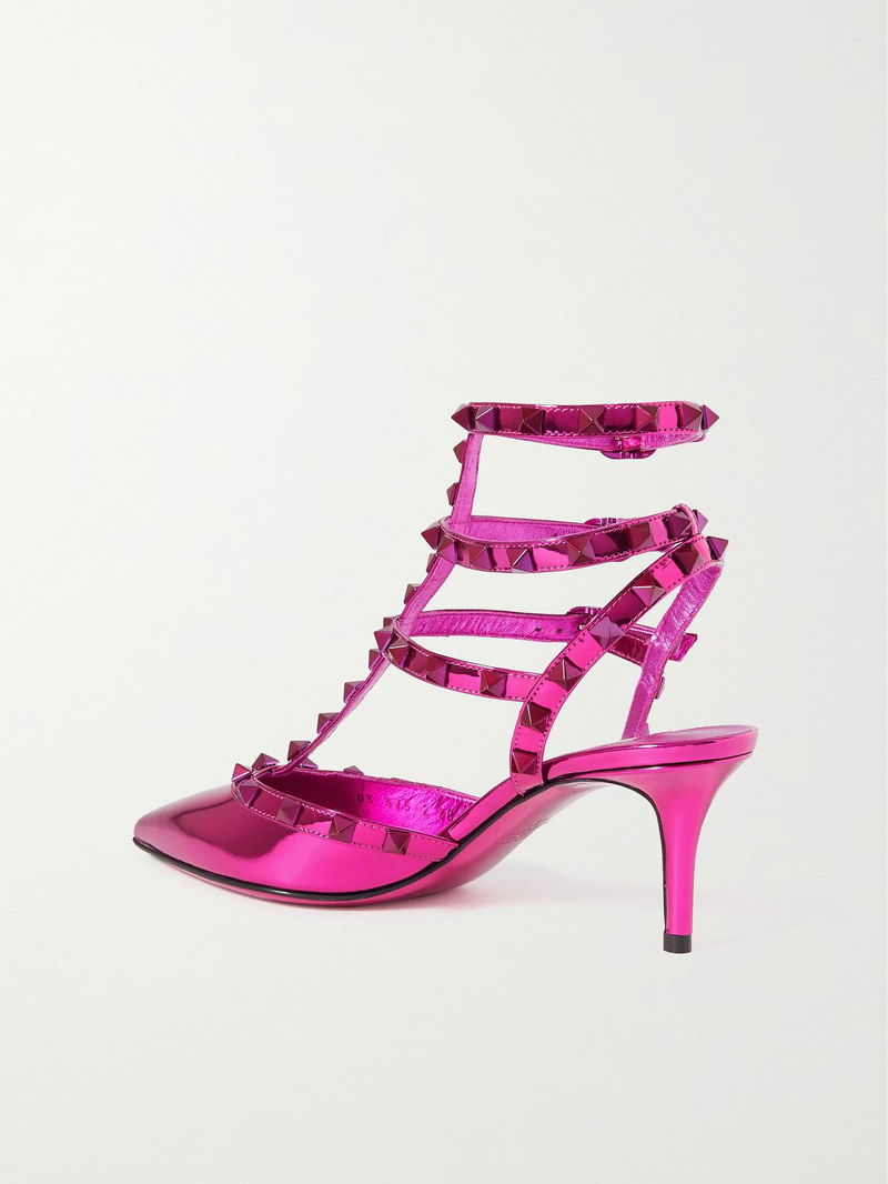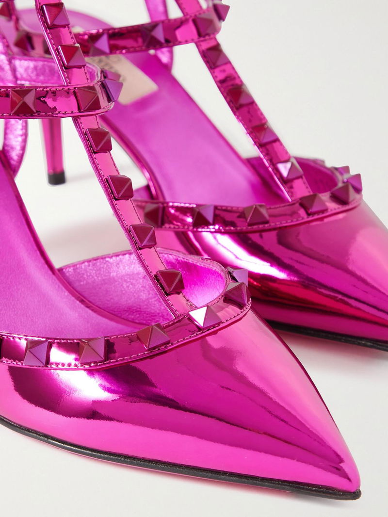 The 'Rockstuds' on Valentino Garavani's pumps are meticulously applied by hand to achieve perfect placement. They've been made in Italy from high-shine mirrored-leather with caged ankle straps and pointed toes. The 65mm heels are just right for daytime events.