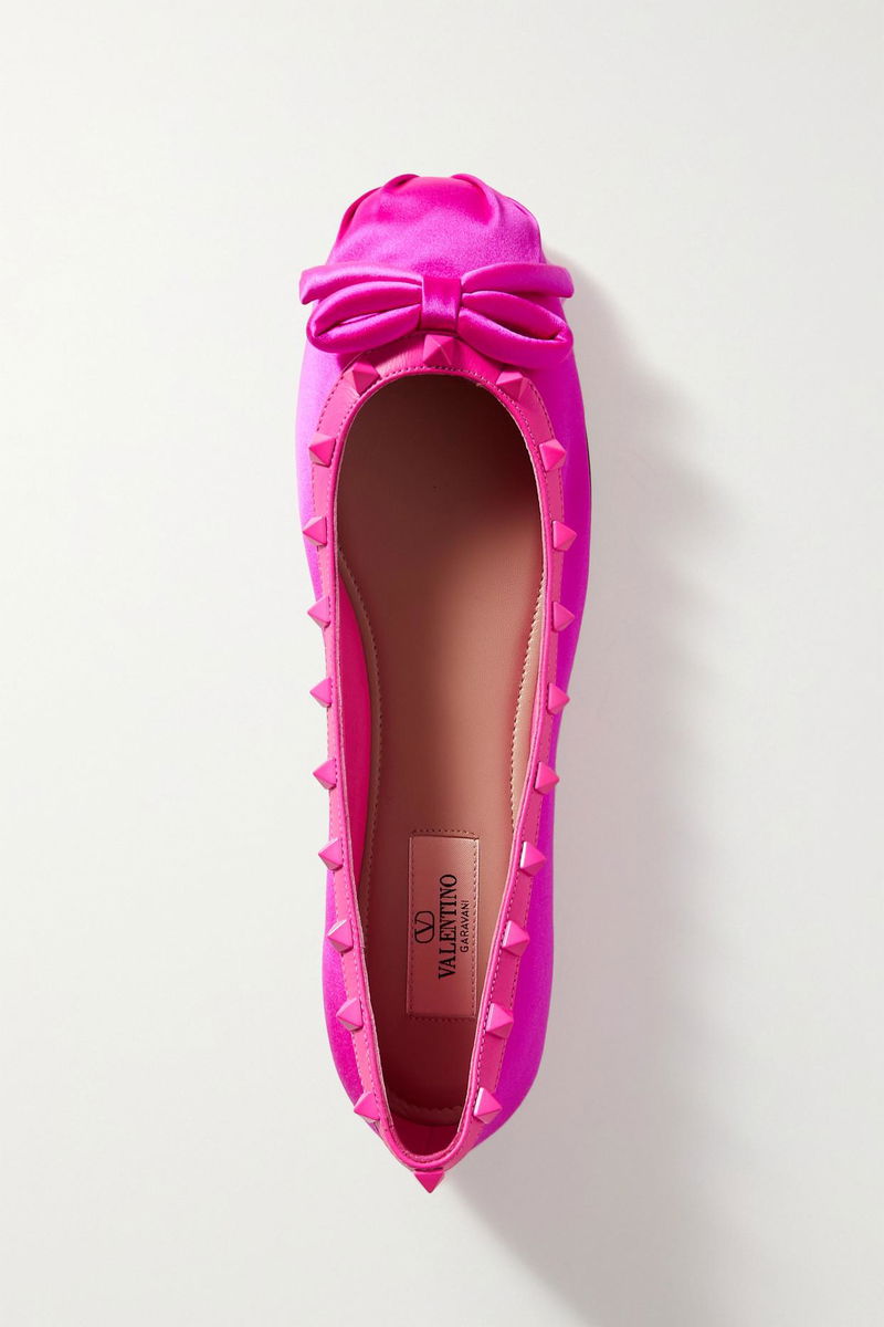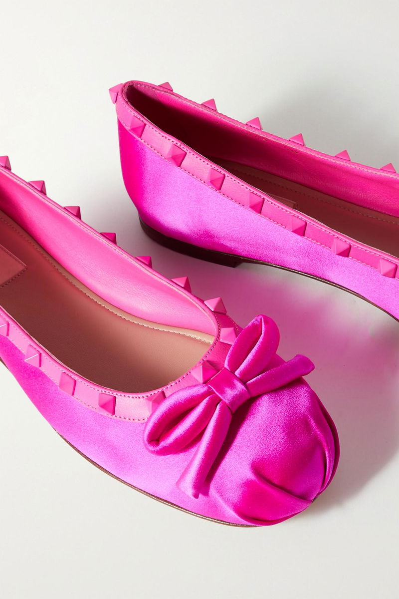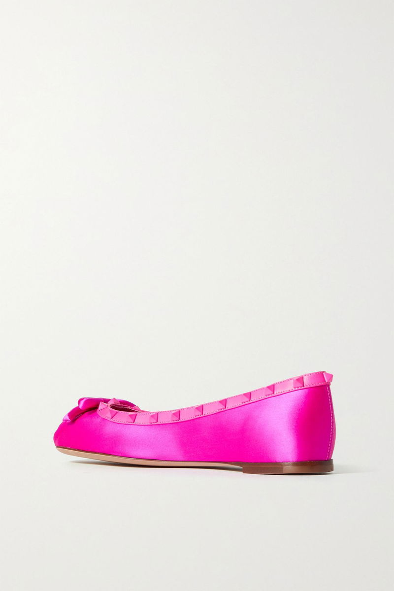 Ballet flats are a chic and comfortable choice for so many occasions. Valentino Garavani's version is made from lustrous fuchsia satin and embellished with sweet, dimensional bows and signature 'Rockstuds' along the leather trims.