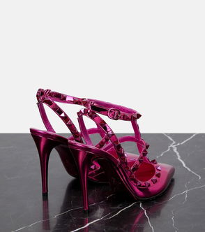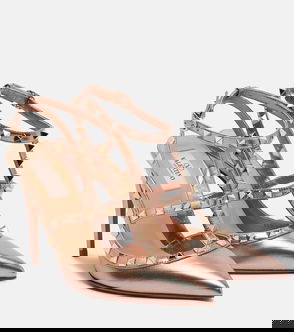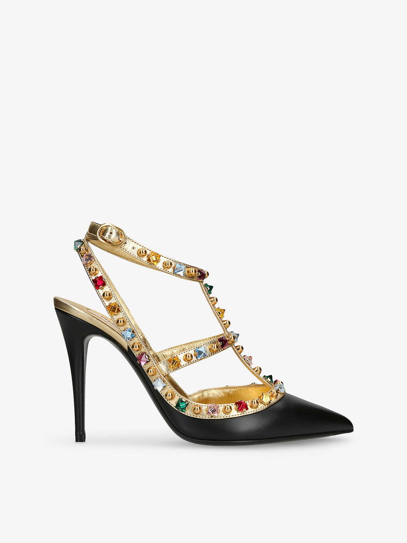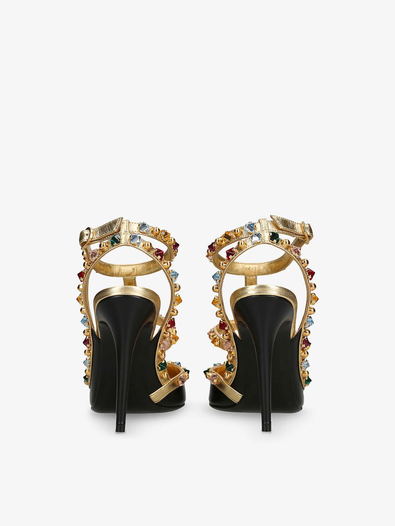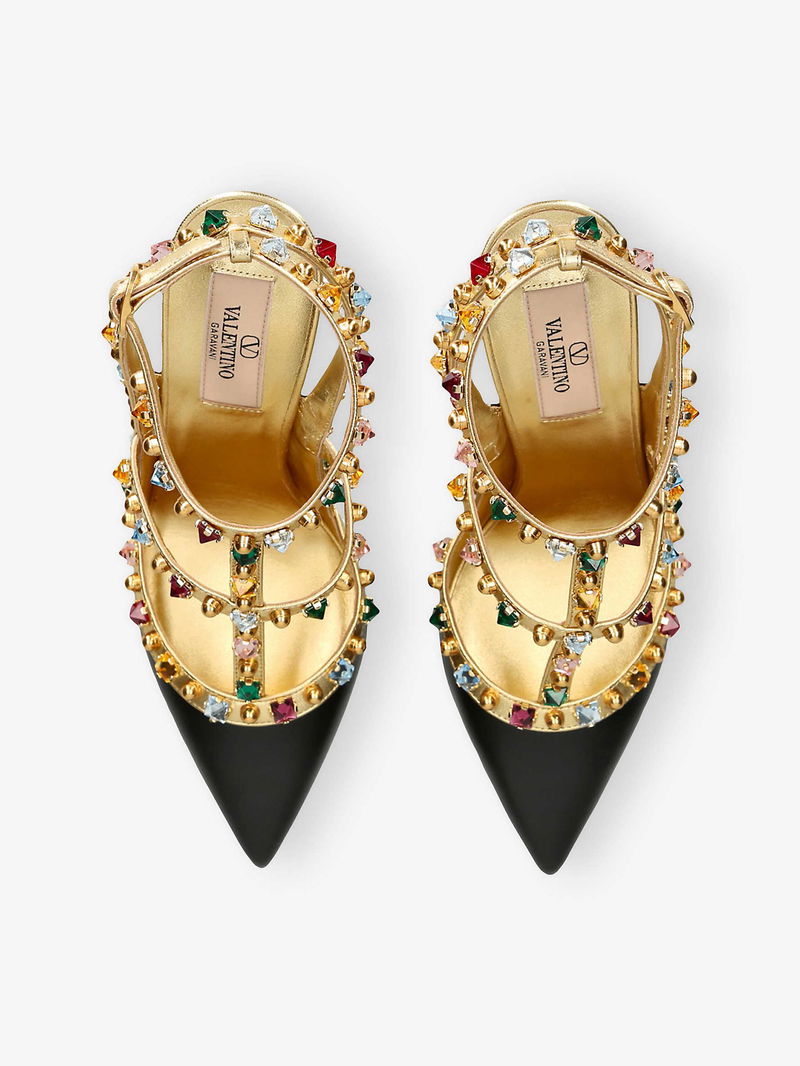 Pointed closed toe, crystal-embellished Rockstuds, caged design, branded footbed, gold-toned hardware, metallic finish, high stiletto heel