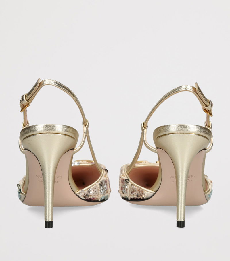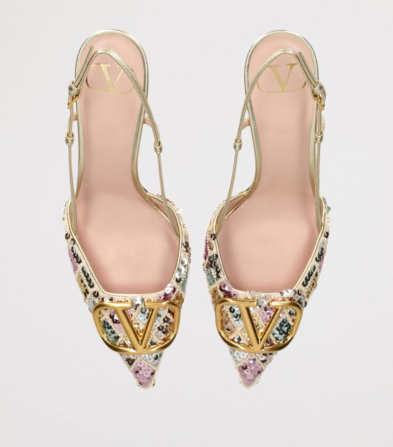 Valentino Garavani's VLogo Sling Back Heels shimmer from every angle, their outer covered in sparkling sequins with the iconic logo perched on top for a bold, unmistakable finish.