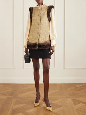Valetino Garavani's coat has heirloom appeal. It's made from wool-blend brocade that's woven with ornate metallic blooms on a midnight black base. The elegant Nehru collar and glamorous shearling cuffs are chic finishing touches.