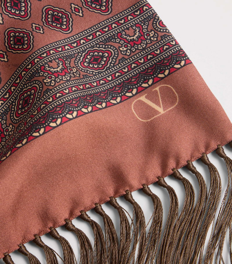 Statement accessories are Valentino Garavani's forte, as exemplified by this silk scarf. The versatile piece - which can be draped over the shoulders or tied around the head for a bohemian bandeau effect - features an all-over geometric motif reminiscent of the bold patterns popular in the '70s. Meanwhile, a fringe trim lends a soft sense of movement to this styling staple.
