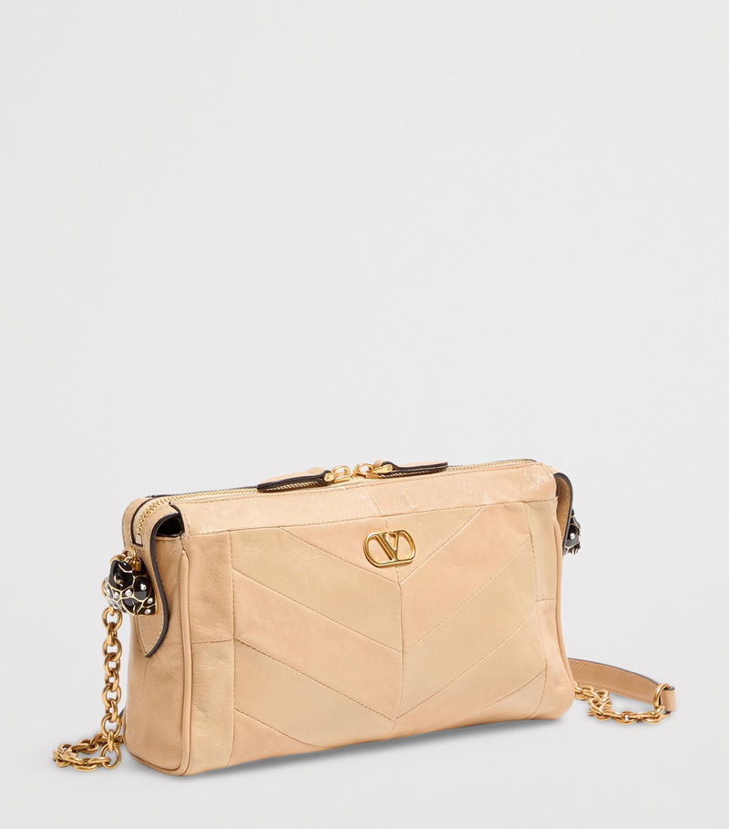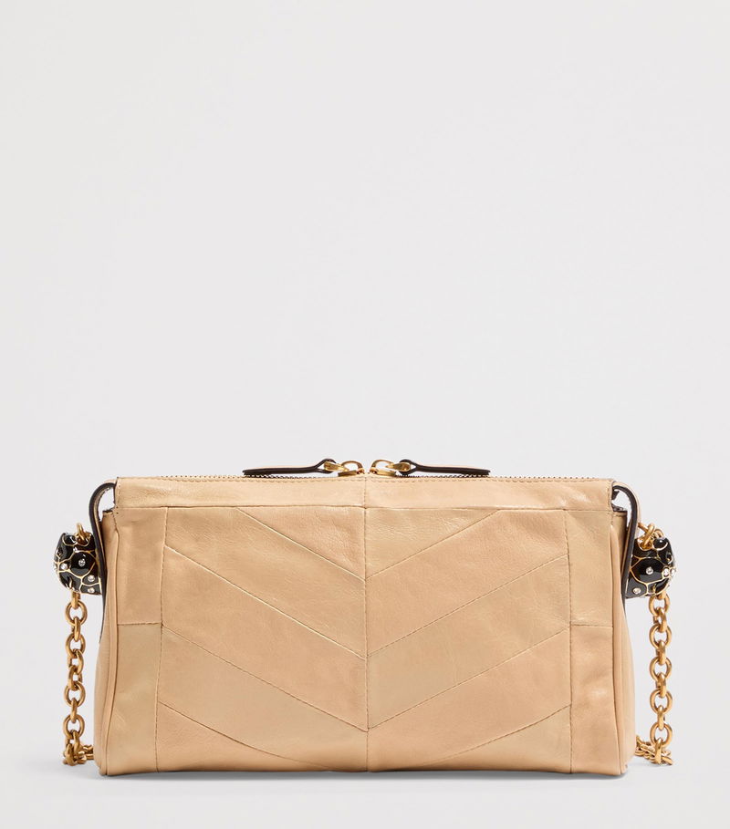 Constructed from chevron-stitched panels of nappa leather, the capacious style gets its name from the two Swarovski-encrusted enamelled panther heads that punctuate the chain strap.