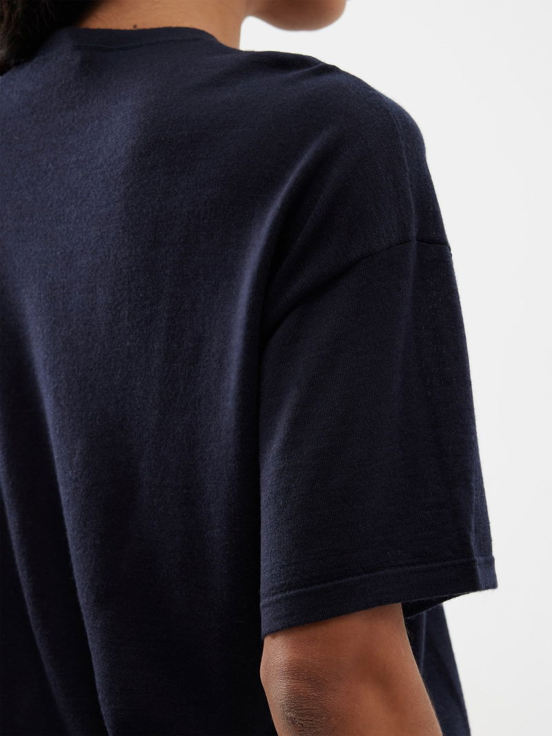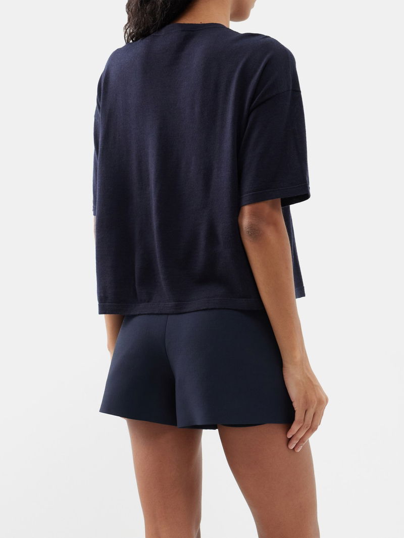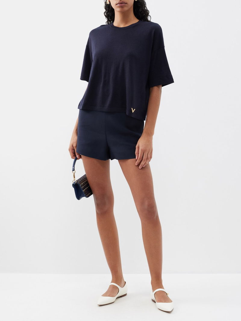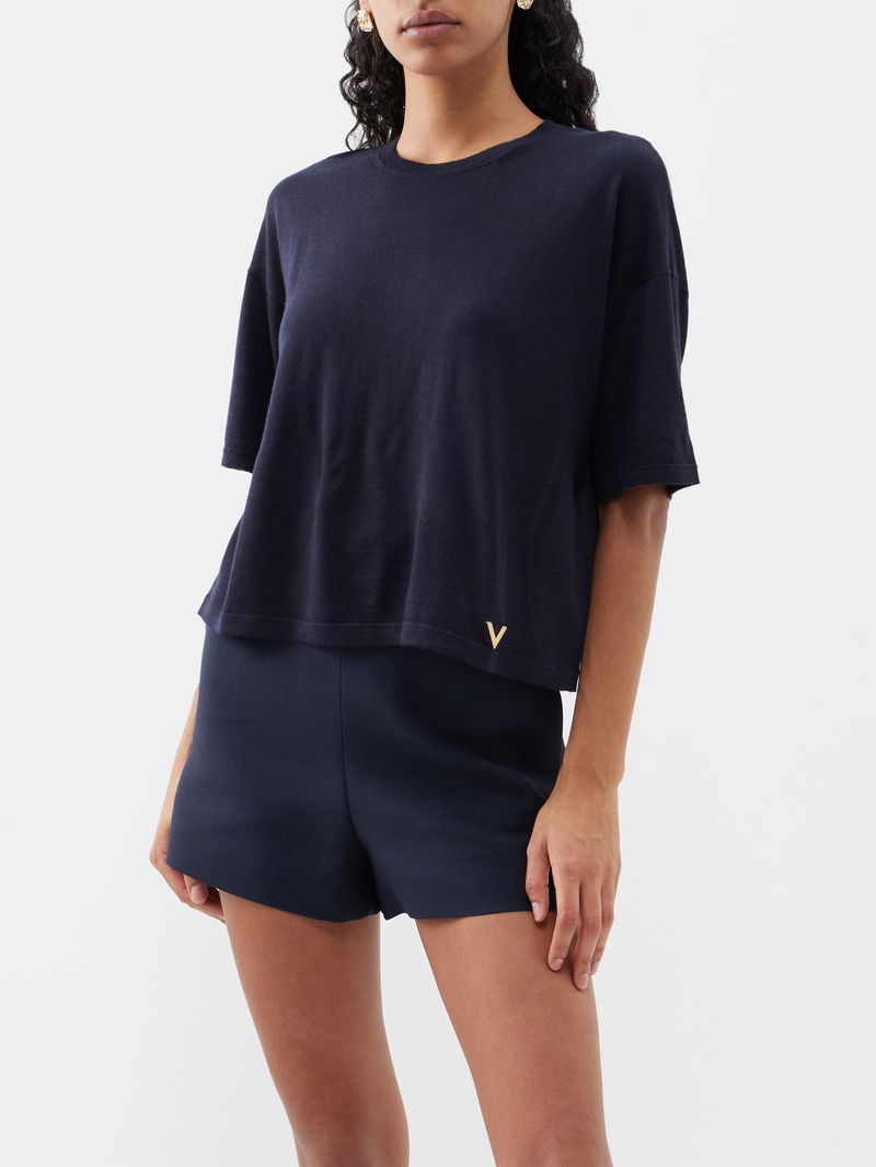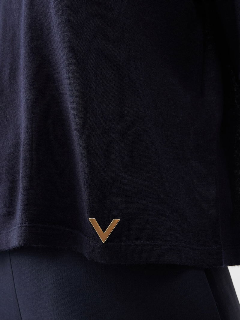 Valentino Garavani's navy top is knitted from a fine-gauge cashmere and silk blend, with a relaxed drape that's highlighted by a hem V-Gold plaque.