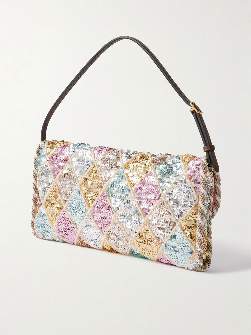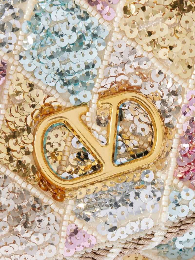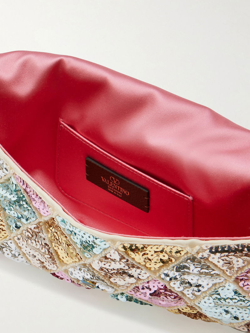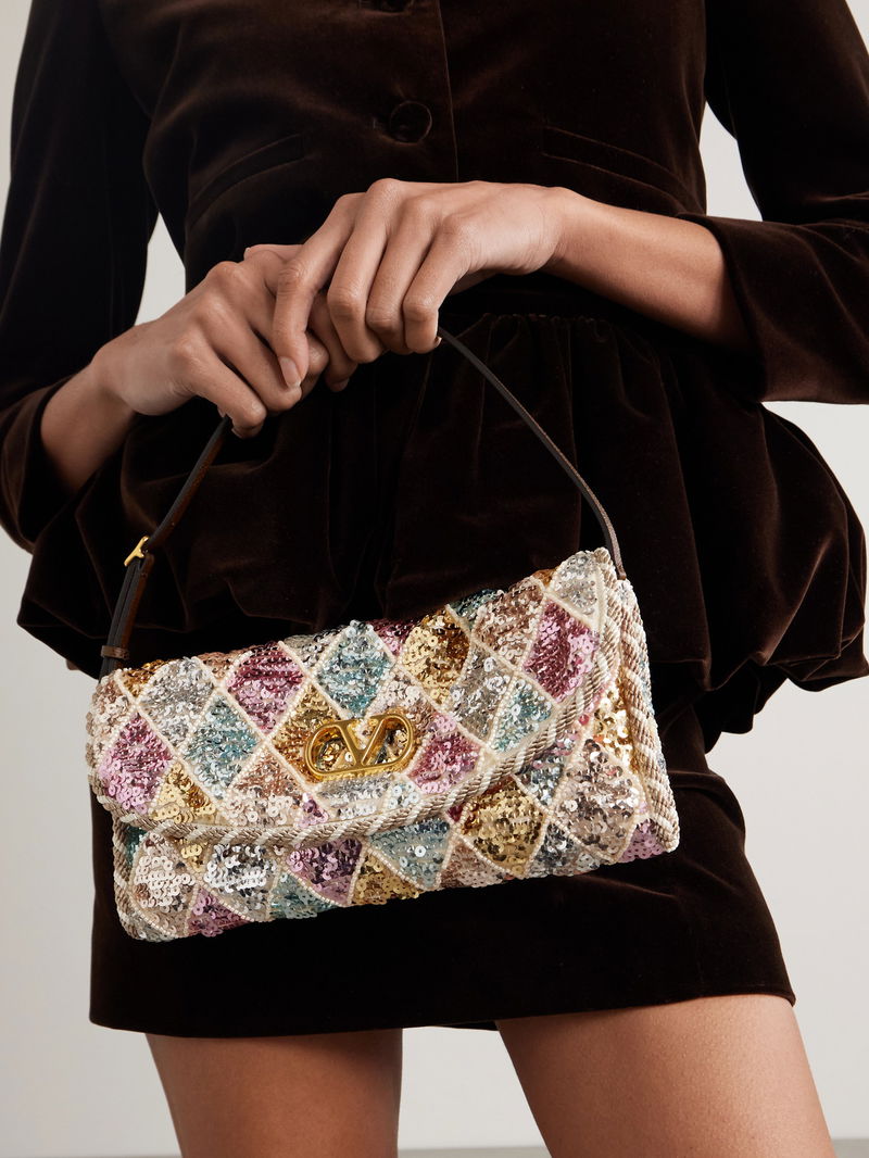 Valentino Garavani's 'Vain' clutch has so much attention to detail - it's covered with iridescent and gold sequins and rows of faux pearls to match those on the hammered 'VLogo' hardware. It has a detachable top handle and slinky chain strap that you can switch between, depending on your mood. Stow your mints, cardholder and lipstick inside.