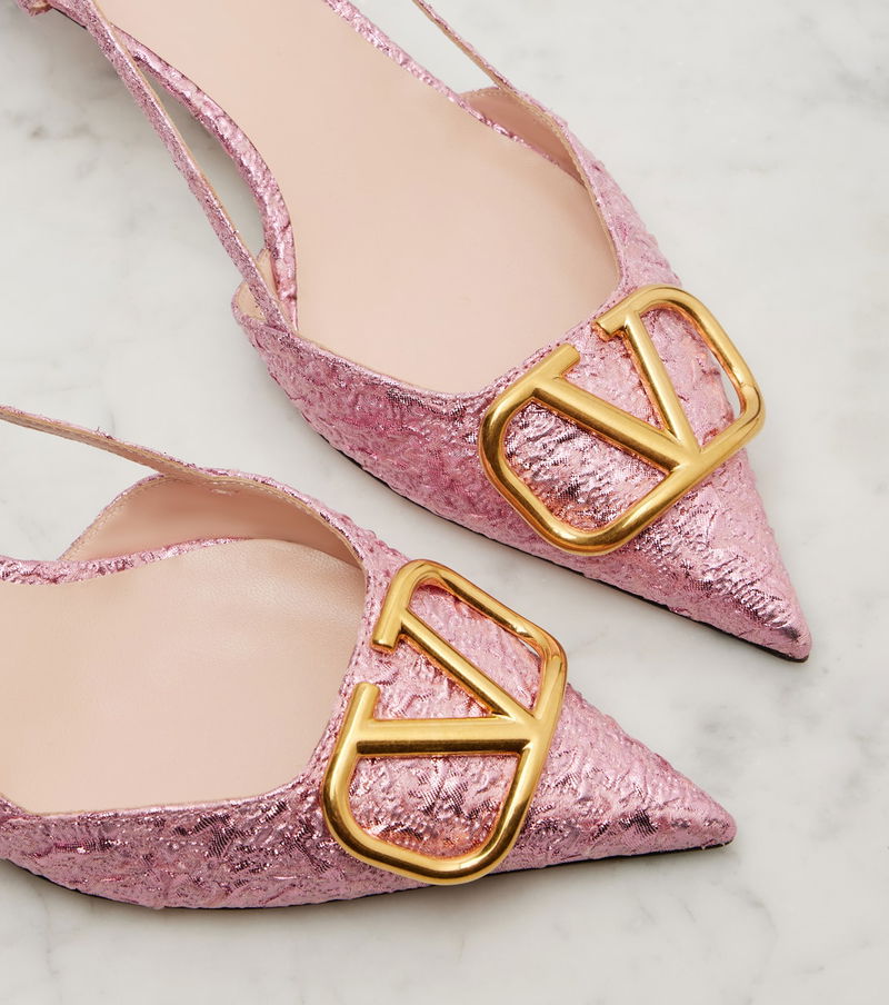 At once iconic and understated, Valentino Garavani's VLogo carries the Maison's legacy of elegance. The beloved code is featured front and center on the vamps of these delicate slingback pumps, crafted from cloqué jacquard.