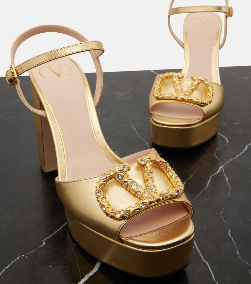 Step in style with these sandals from Valentino Garavani. Crafted in Italy from gold-hued metallic leather, the elegant pair features round open-toe silhouettes with shimmering crystal embellishments and the house's signature VLogo hardware.