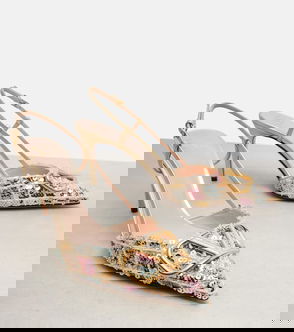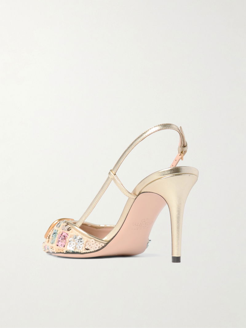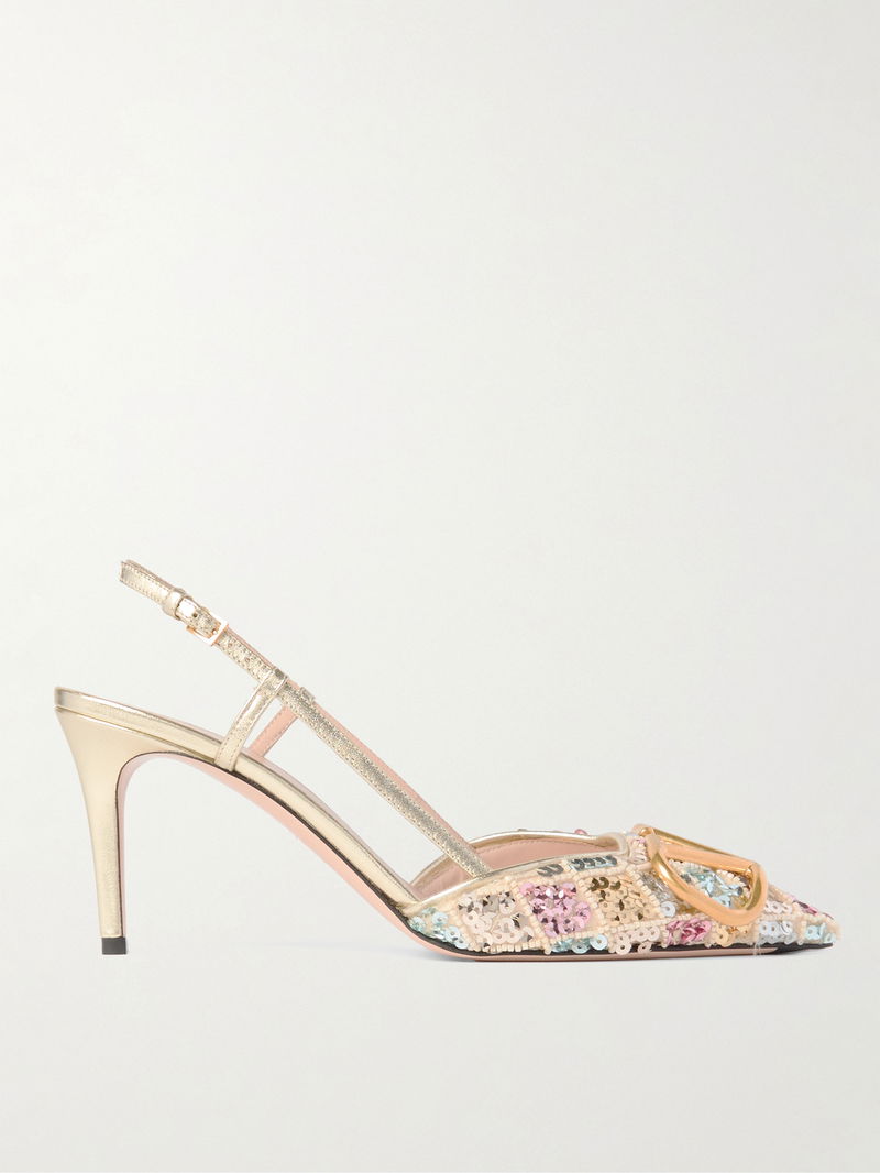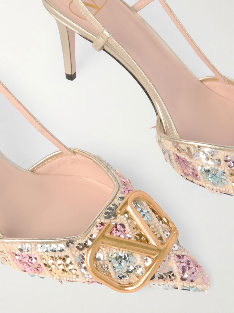 Valentino Garavani's slingback pumps are guaranteed to get you in the mood to party. Made in Italy from metallic leather, they have pointed toes embellished with a lattice of sequins and beads and are topped with 'VLogo' hardware. The slim 80mm heels offer a comfortable lift.