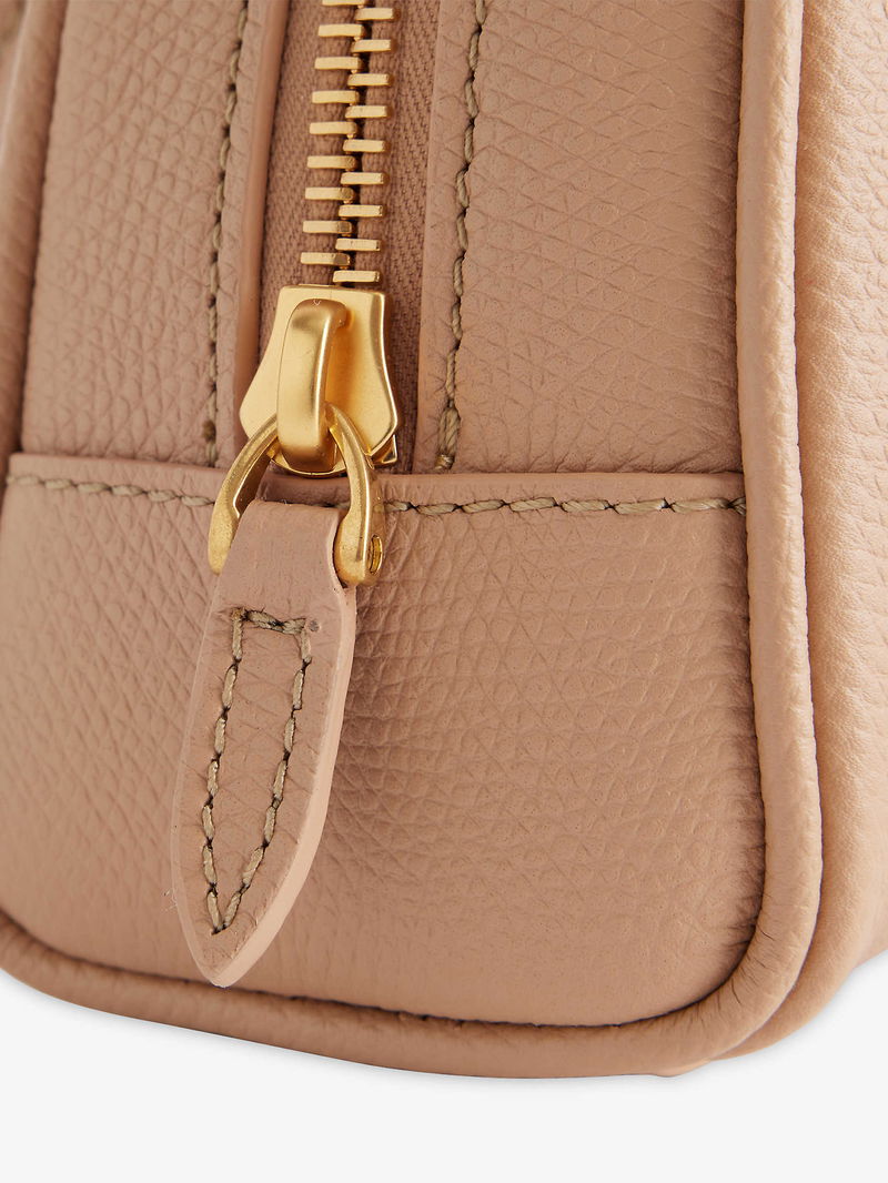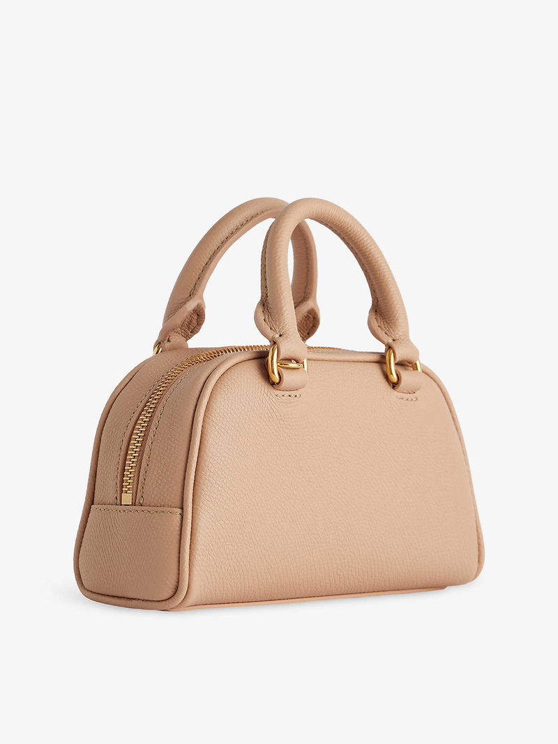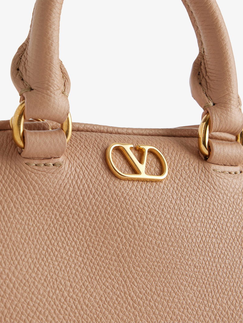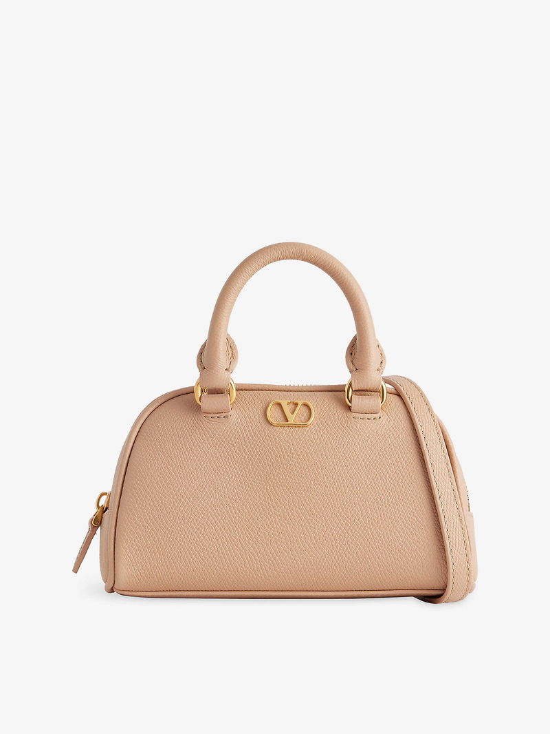 Valentino Garavani leather bowling bag. Structured, double top handles, detachable adjustable shoulder strap, monogram plaque at front, all-over grained leather, gold-toned hardware, one main compartment, internal card slot, fully lined.