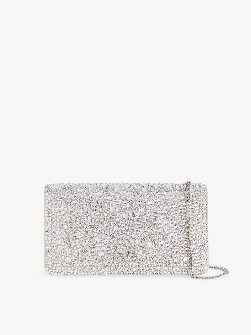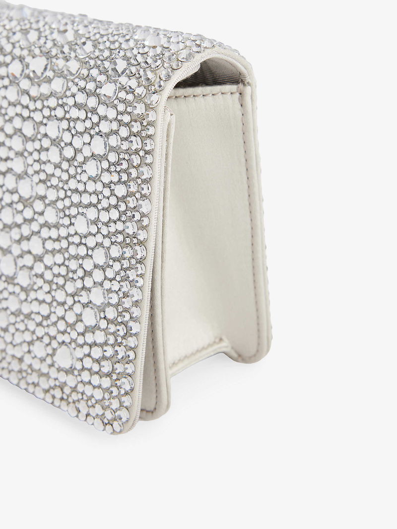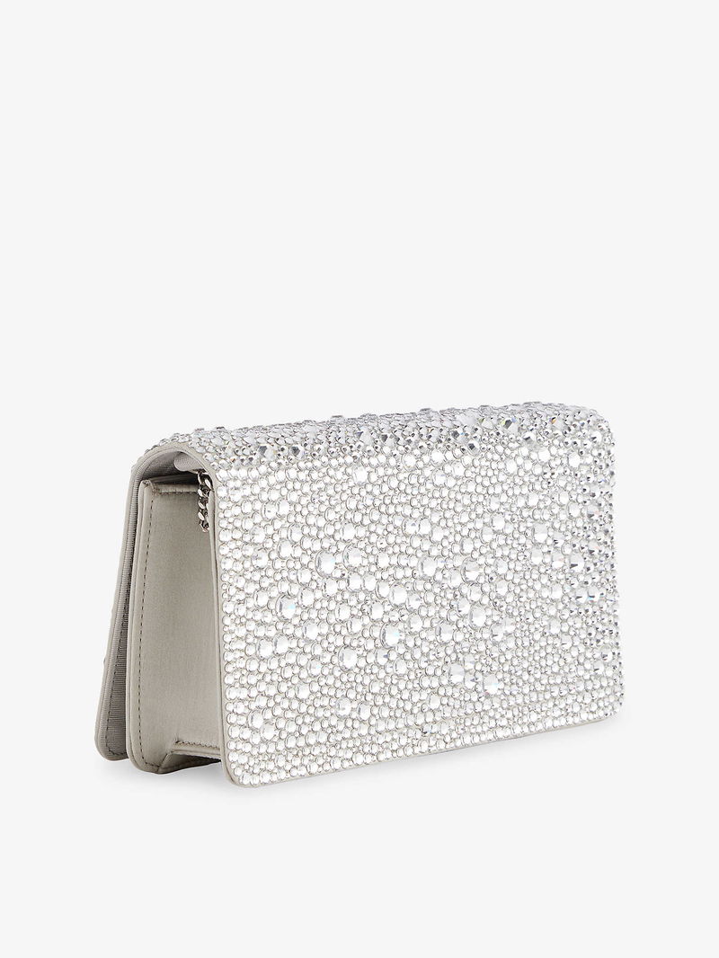 Valentino Garavani crystal-embellished wallet-on-chain. Rectangle shape, chain-link shoulder strap, VLogo Signature plaque at front, front flap, one main compartment, one interior slip pocket, all-over crystal embellishments.