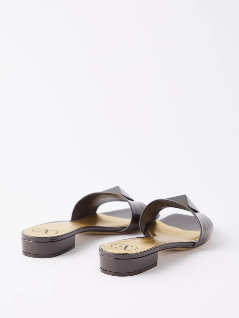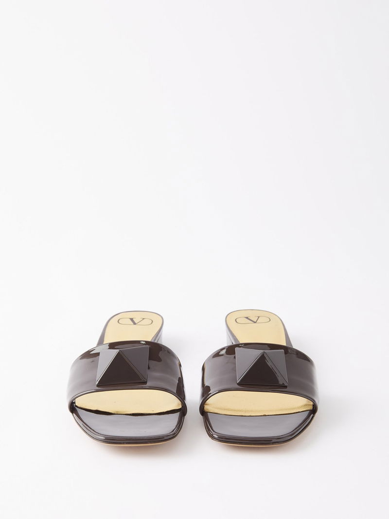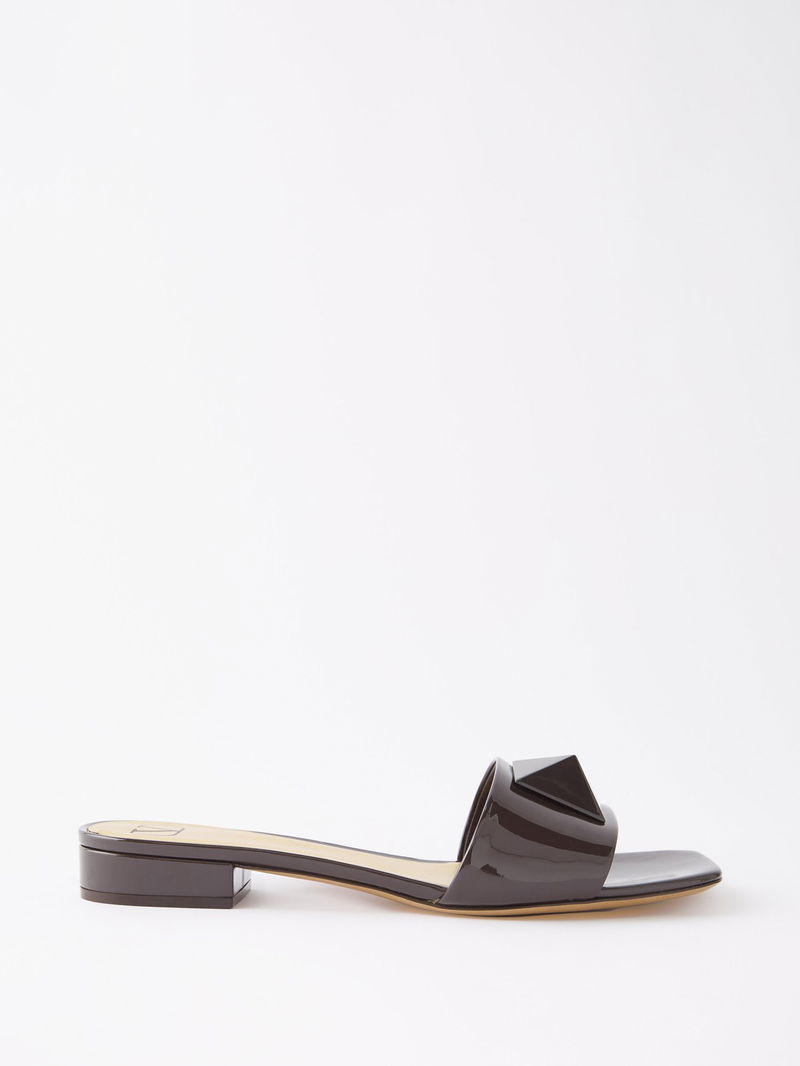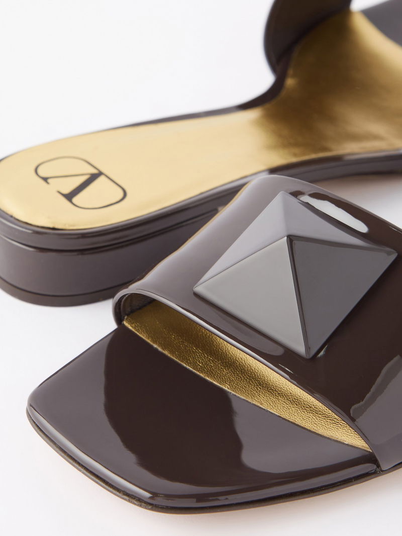 Valentino Garavani's dark brown One Stud sandals are Italian-crafted from patent leather and topped with a large pyramid stud across the wide strap.