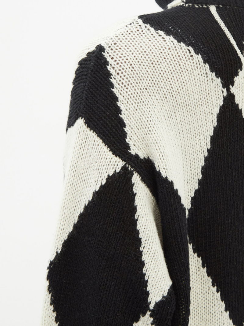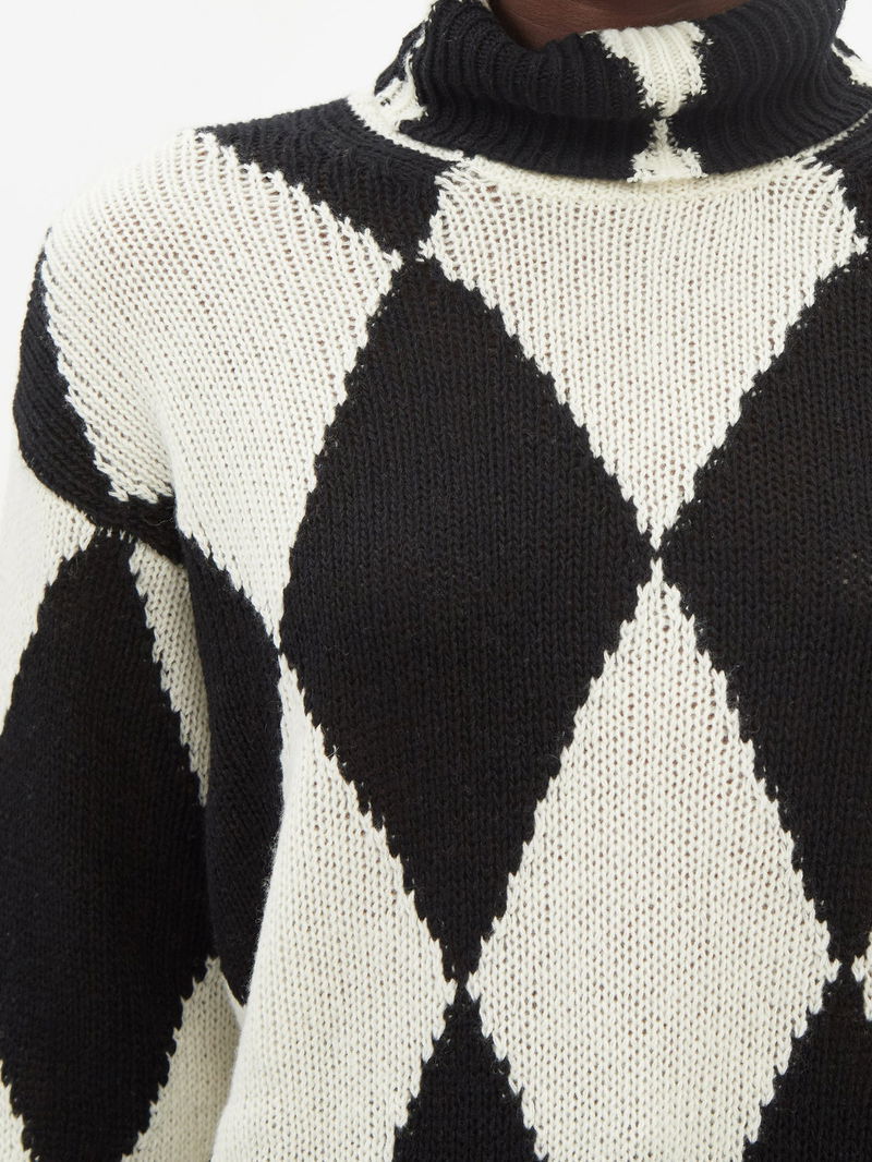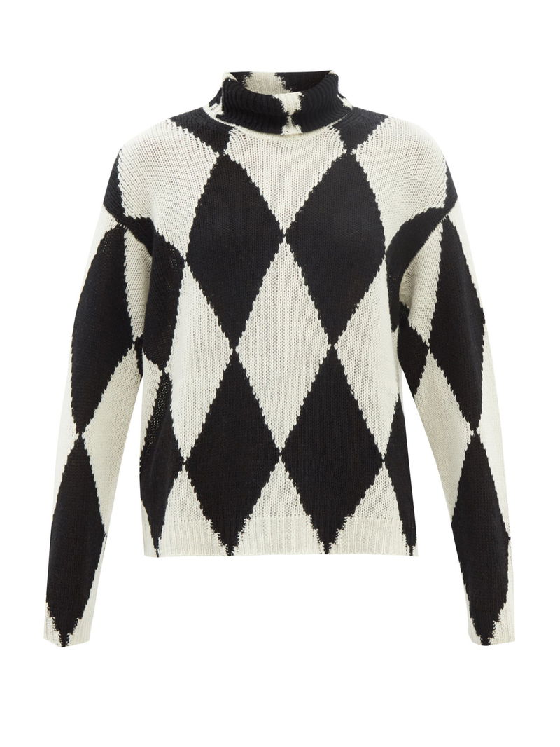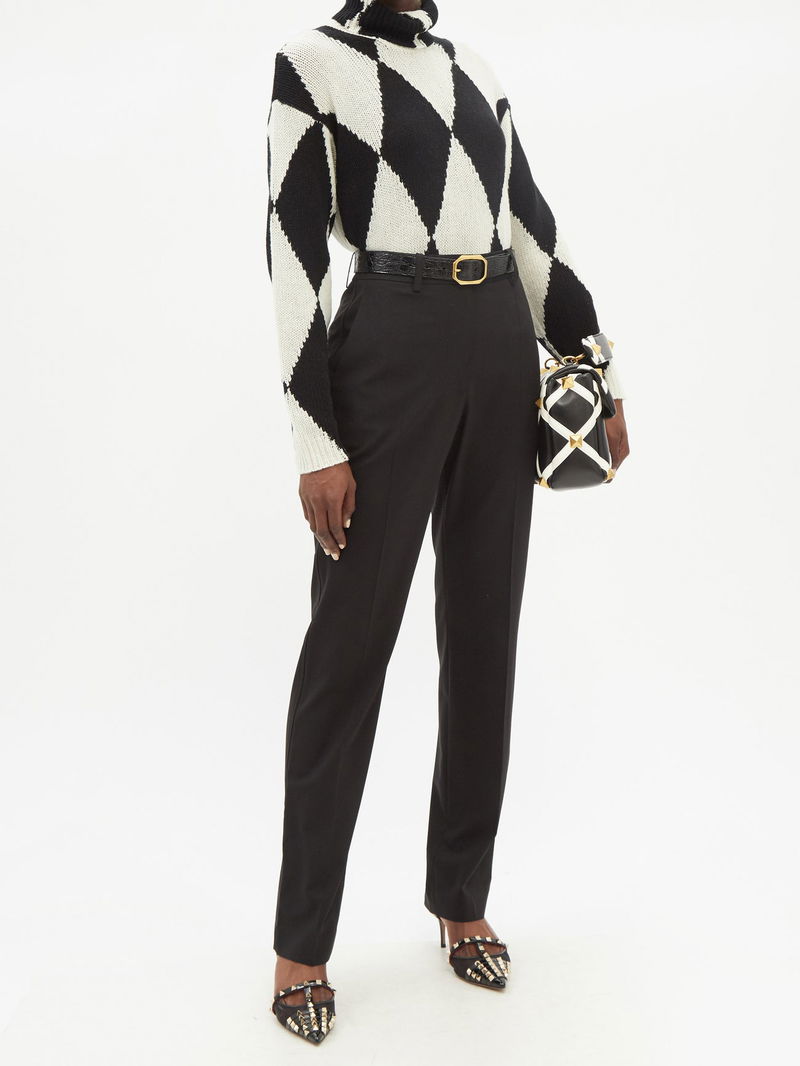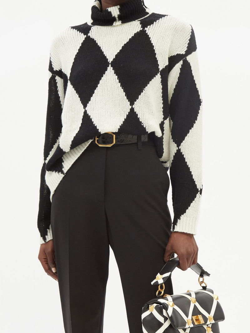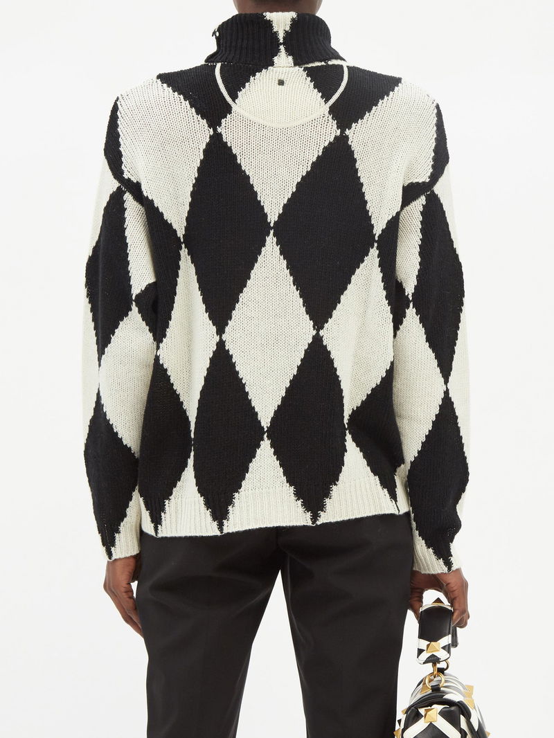 Valentino's black and white diamond-jacquard roll-neck sweater is knitted in Italy from virgin wool blended with cashmere, capturing the house's seasonal punk influences.