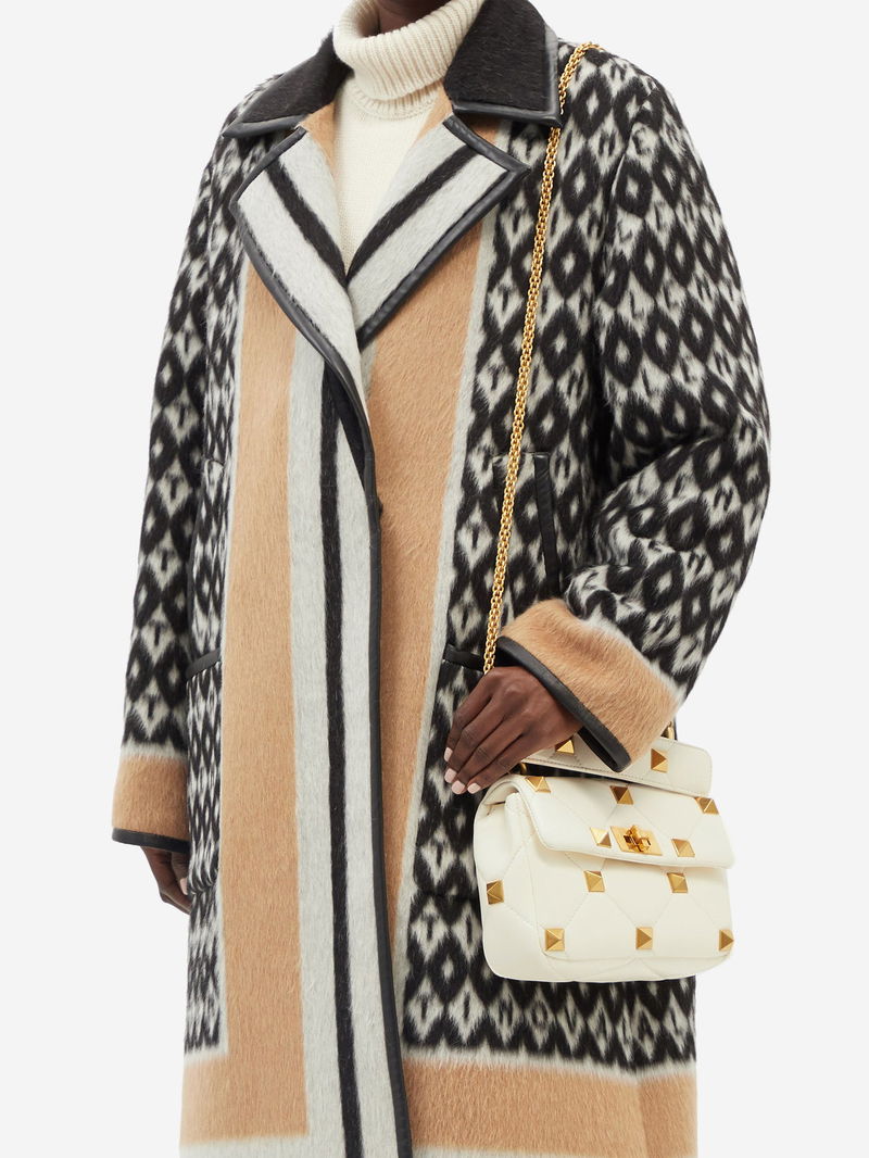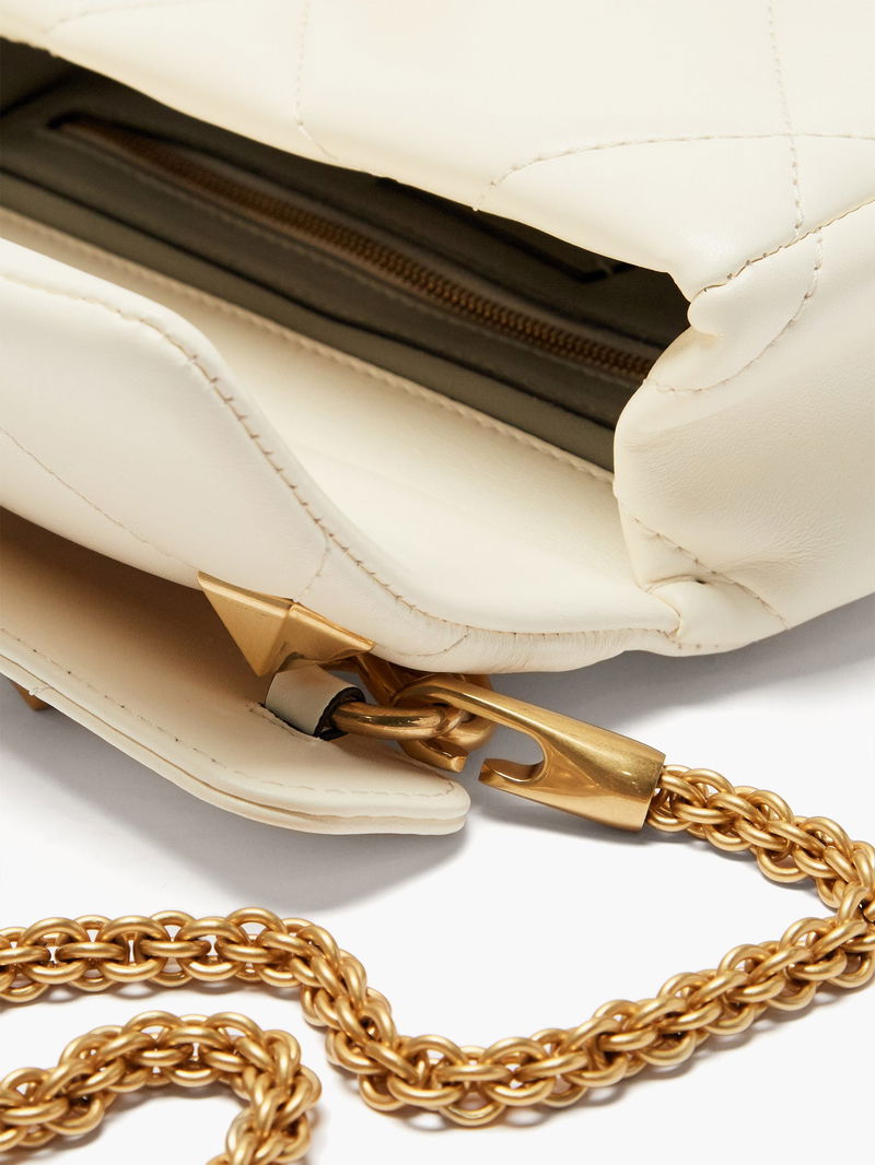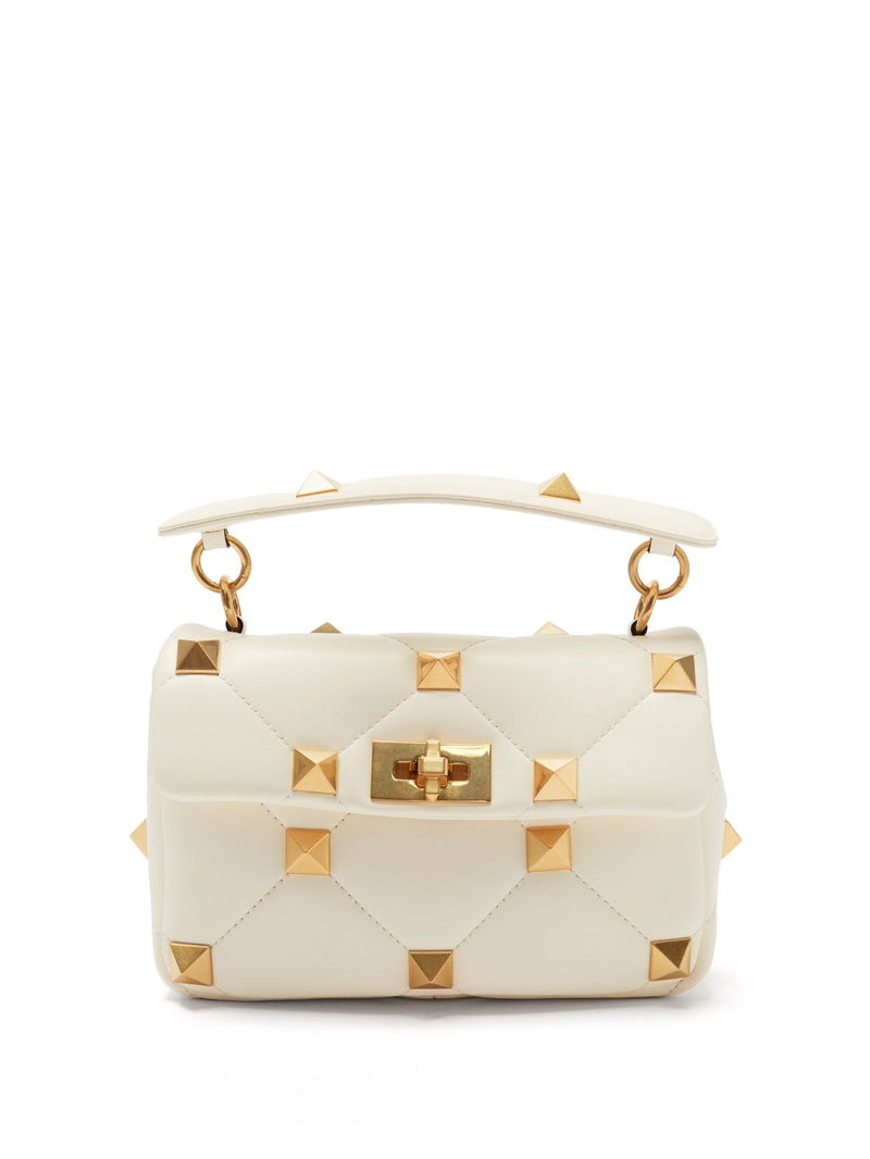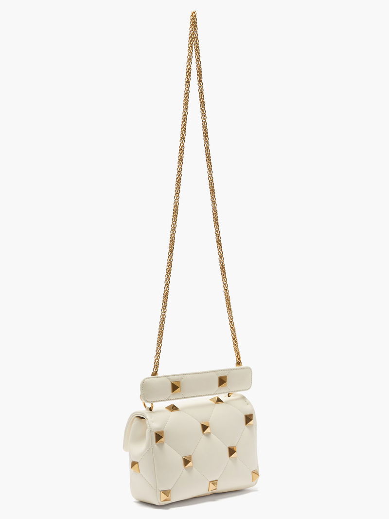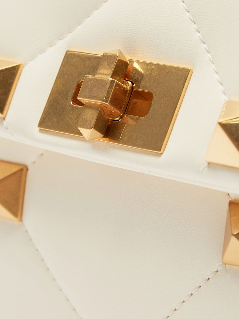 Valentino Garavani's white leather shoulder bag is adorned with the signature Roman Studs which are carefully cast in a metal workshop in Italy.