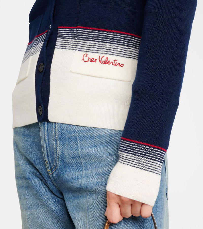 This Valentino cardigan is finely knitted from virgin wool threads and features a figure-hugging silhouette, a striped pattern, and subtle patch pockets. The design is finished with contrast Chez Valentino embroidery.