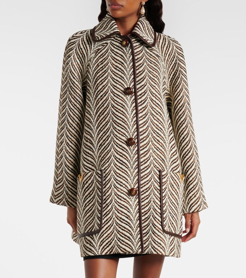 Valentino upholds its legacy of elegance with this sophisticated coat. The piece is Italian-made from wool and cashmere and boasts all-over animal-print patterning, leather trims, and signature VGold accents on the patch pockets.