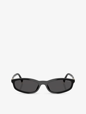 Square frames. Moulded nose pads. Dark-tinted lenses. Branded arms.