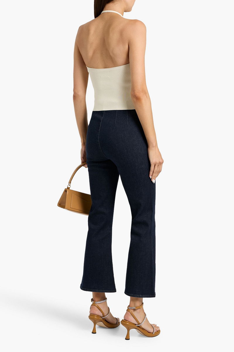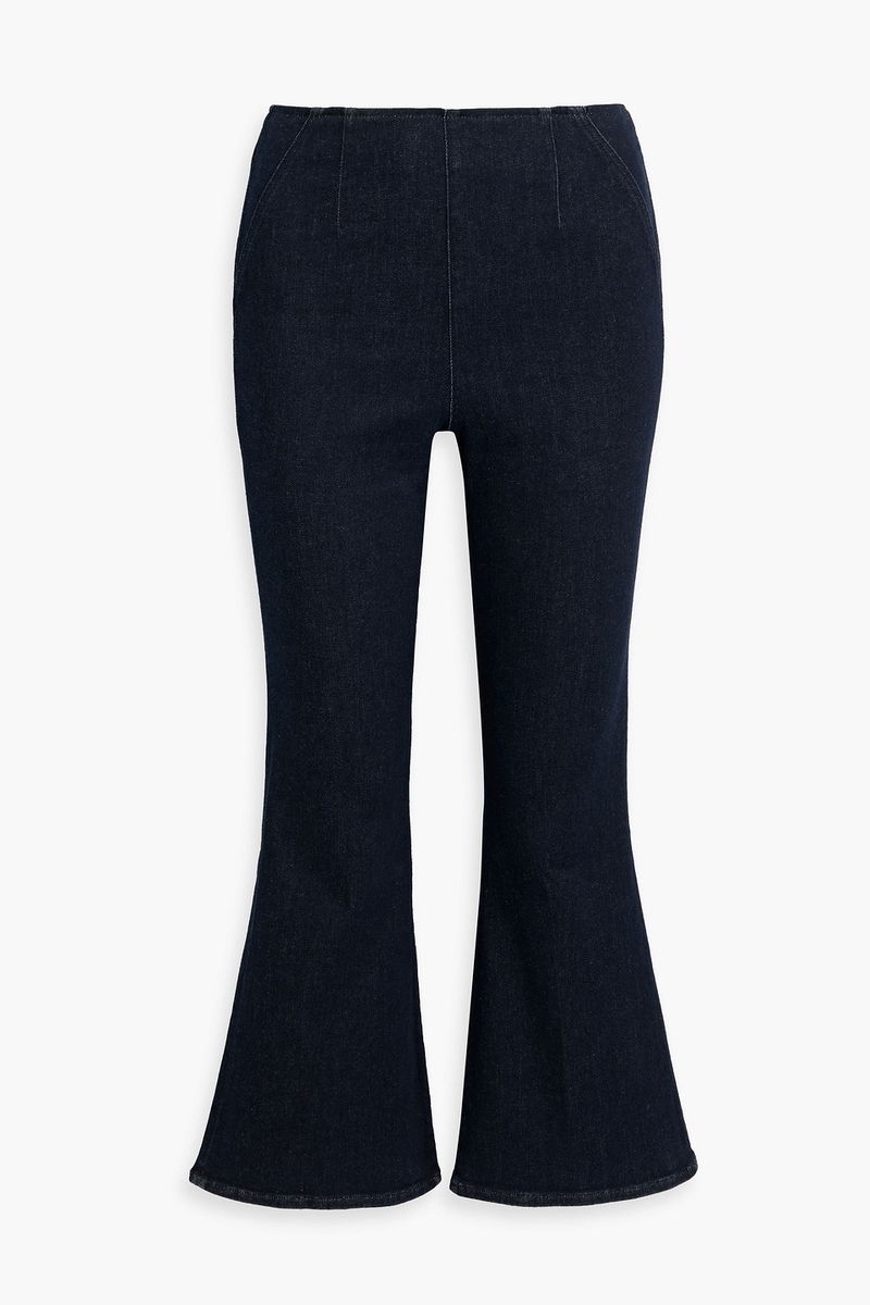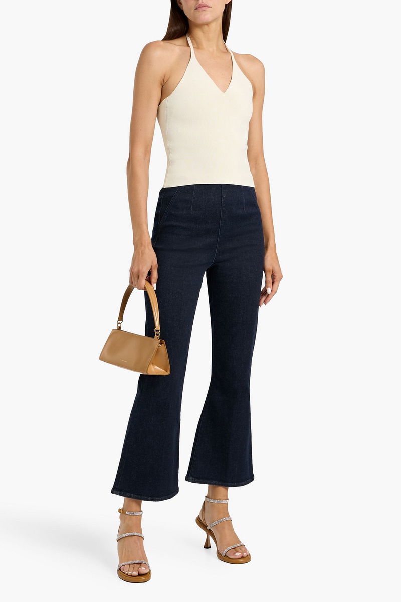 Kick-flare jeans, Denim, Belt loops, High-rise cut, Pull on, Mid-weight, slightly stretchy fabric.