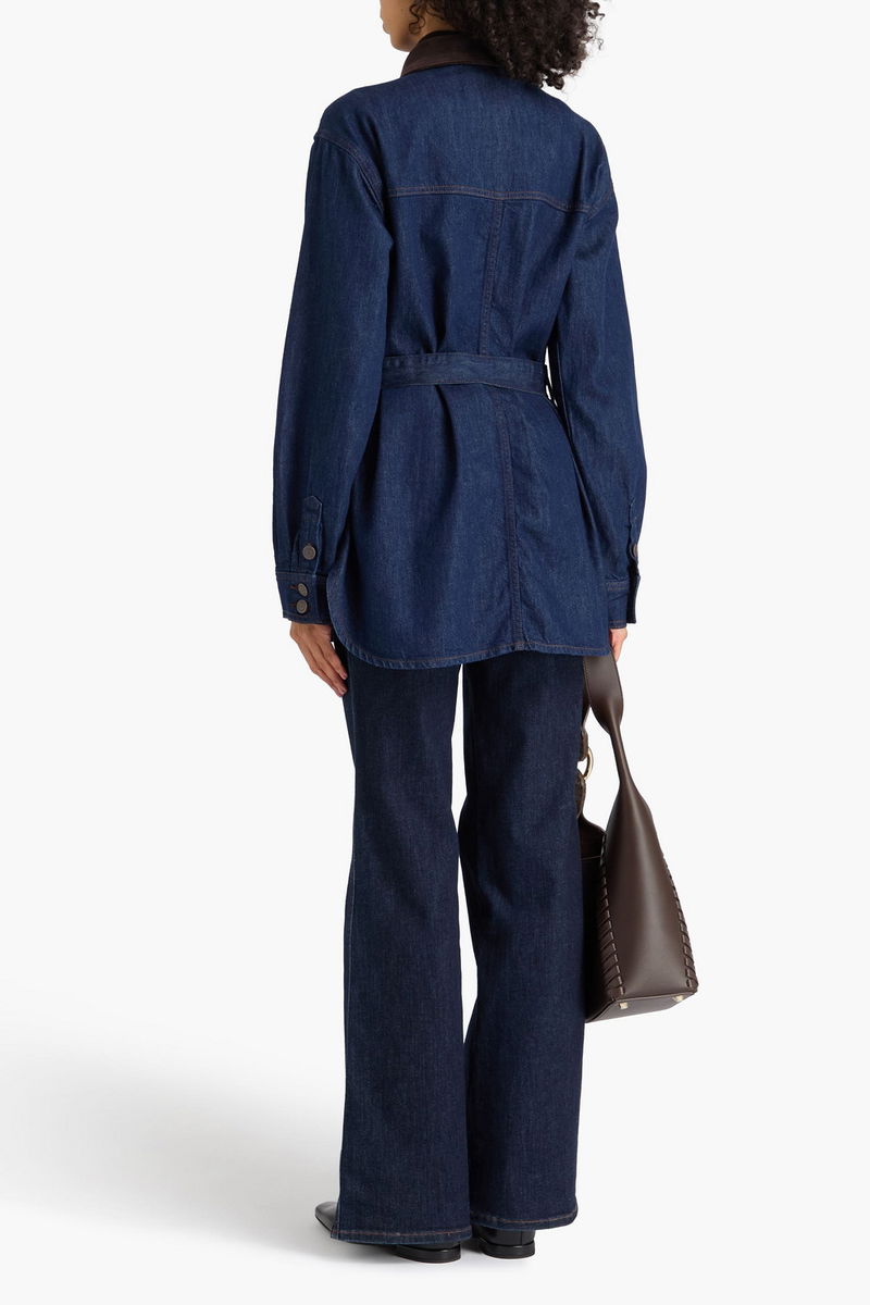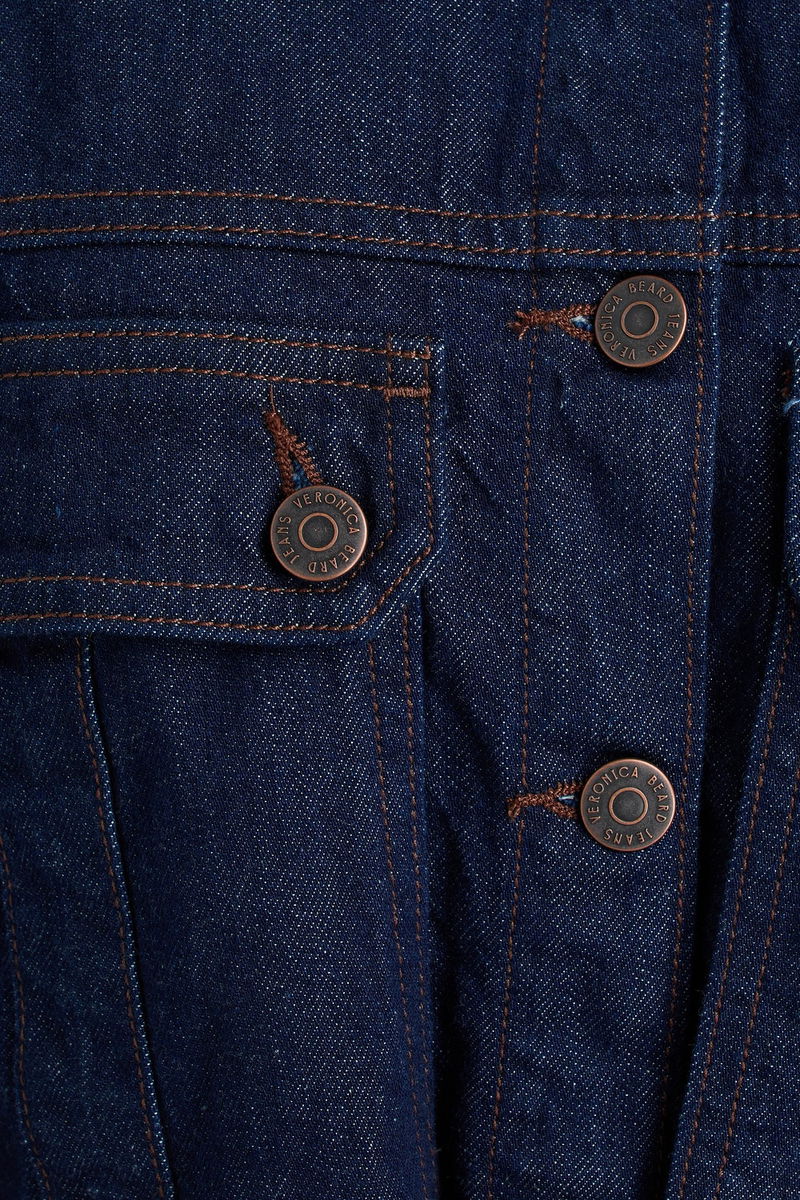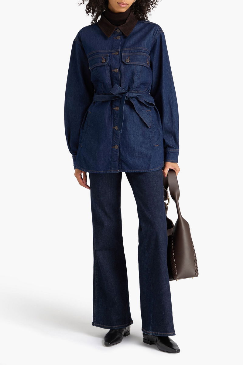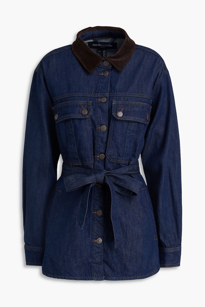 Jacket, Denim, Corduroy trims, Detachable waist tie, Buttoned cuffs, Side slant pockets, Breast pockets, Button fastenings through front.