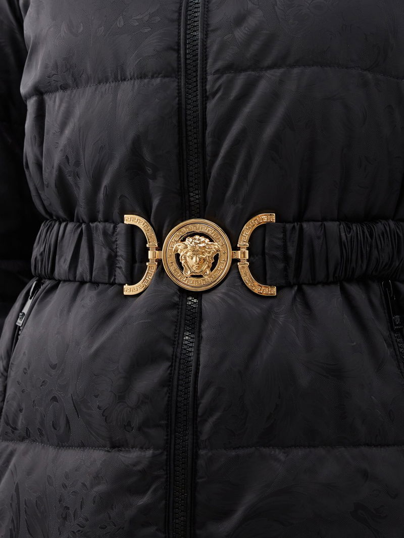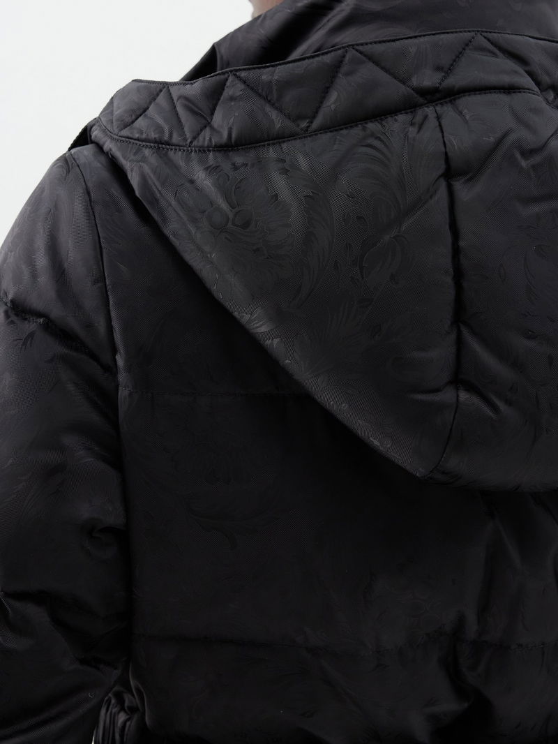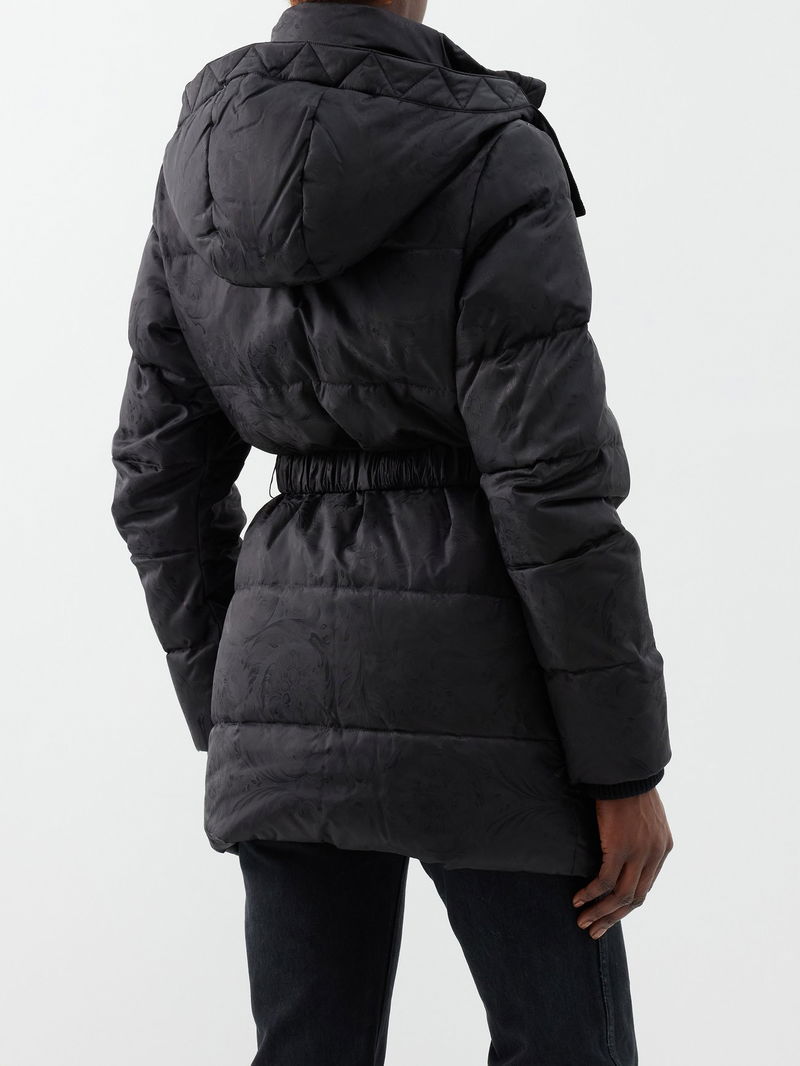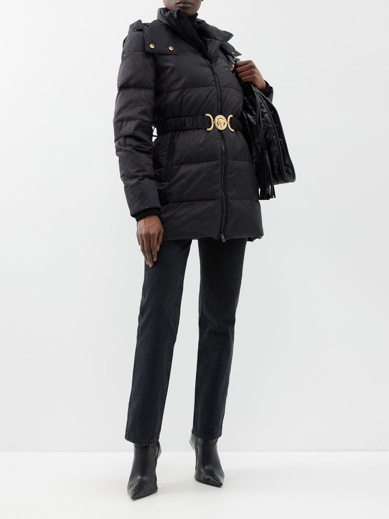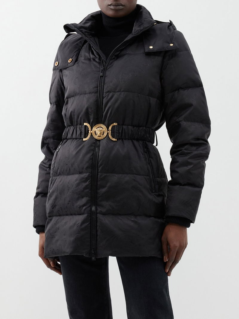 Versace's black padded coat has a jacquard-woven outer displaying the house's iconic Baroque pattern and is fitted with a Medusa-buckle elasticated belt.