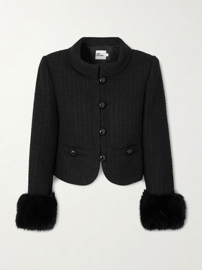 Versace always finds glamorous ways to re-imagine the classic tweed jacket. Woven with glistening metallic checks, this one is made from a cotton-blend and has a cropped shape with a chic, collarless neckline.
