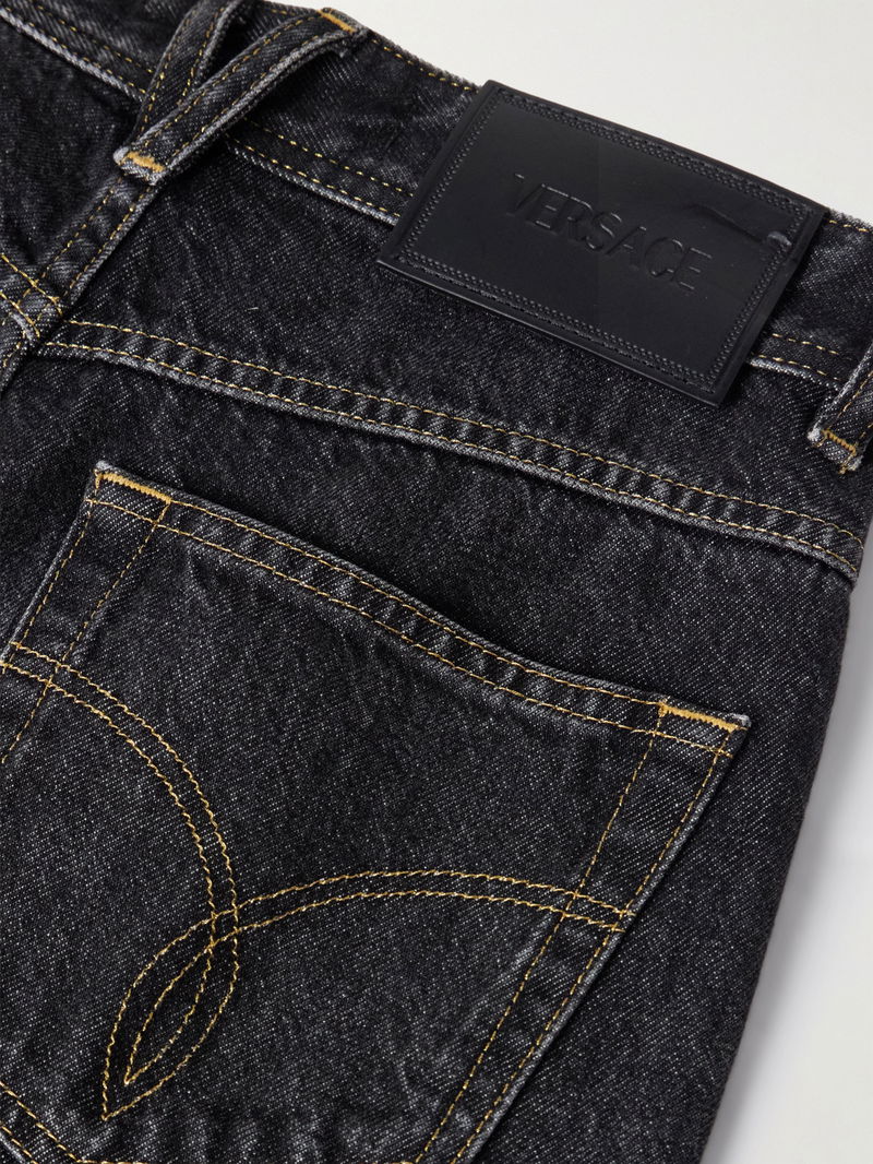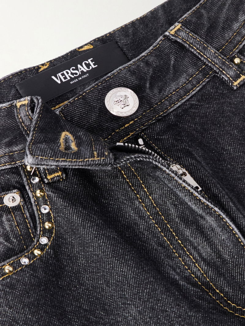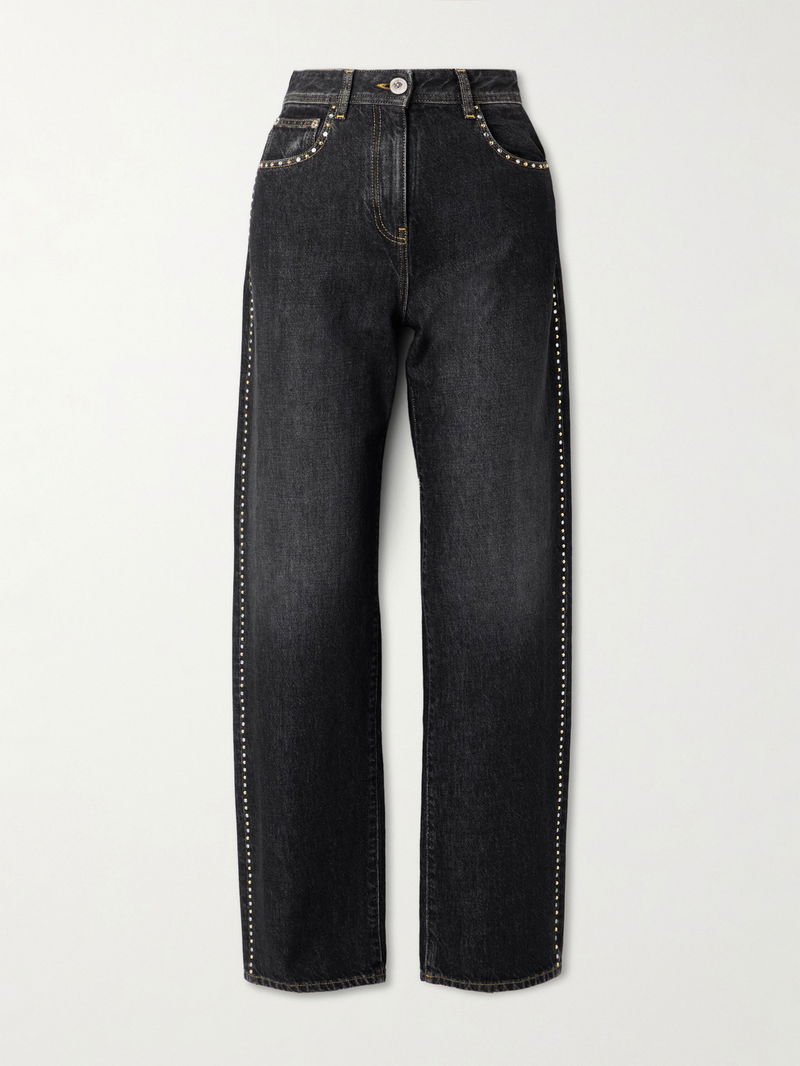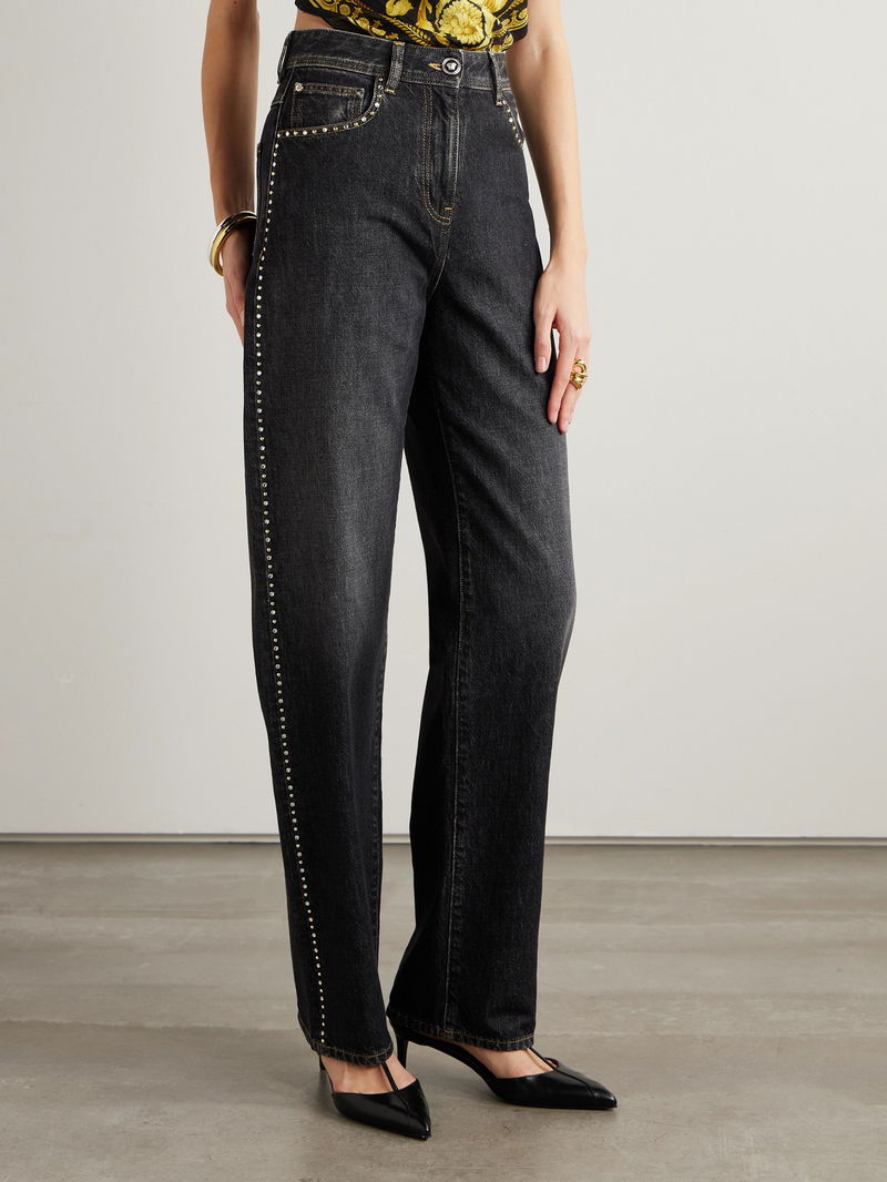 Versace's jeans are detailed with alternating crystals and gold-tone studs that catch the light as you walk. They've been made in Italy from inky denim and have straight legs and a high waist.
