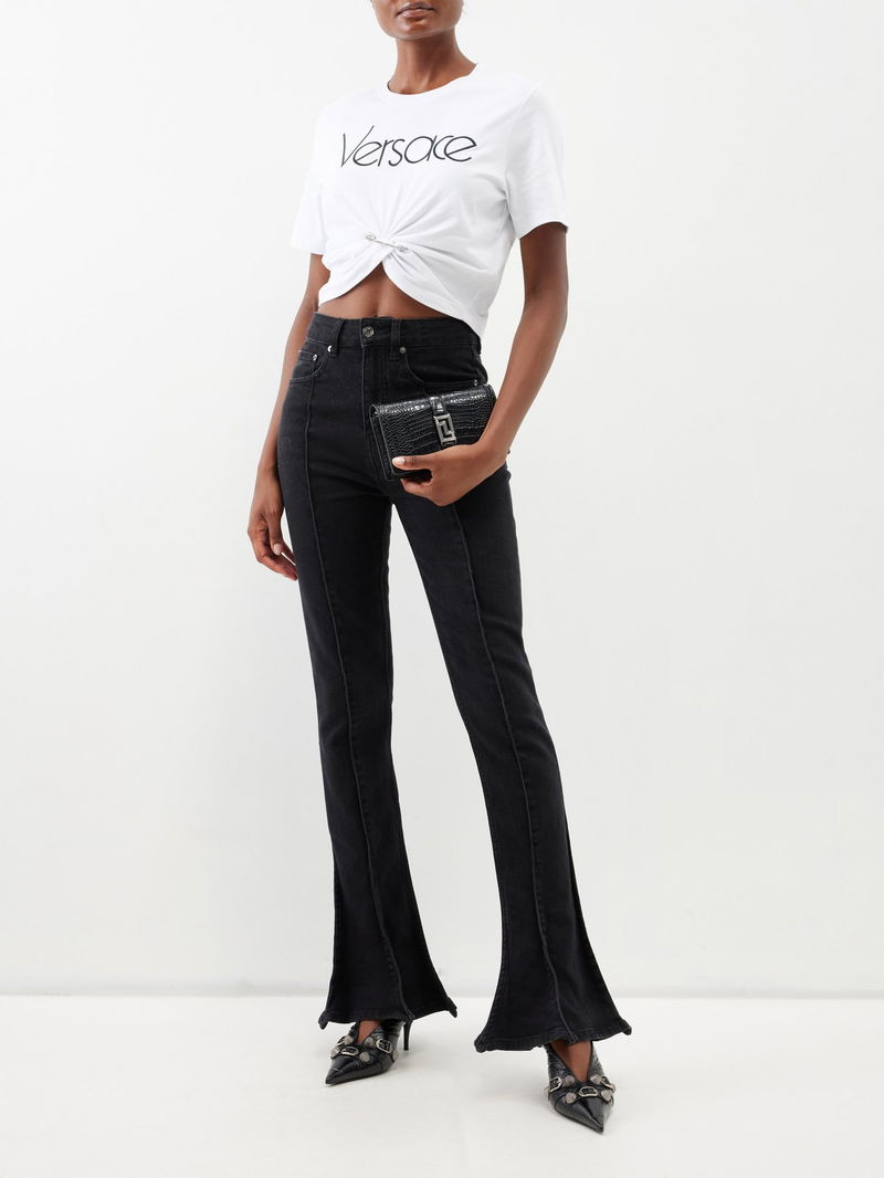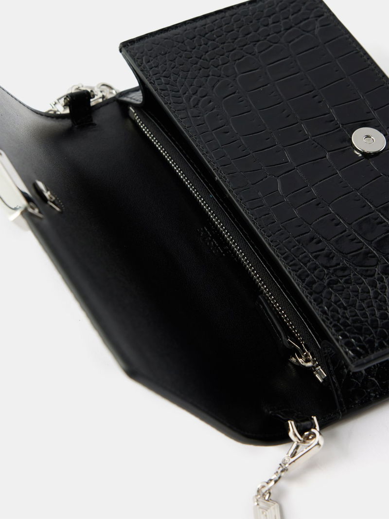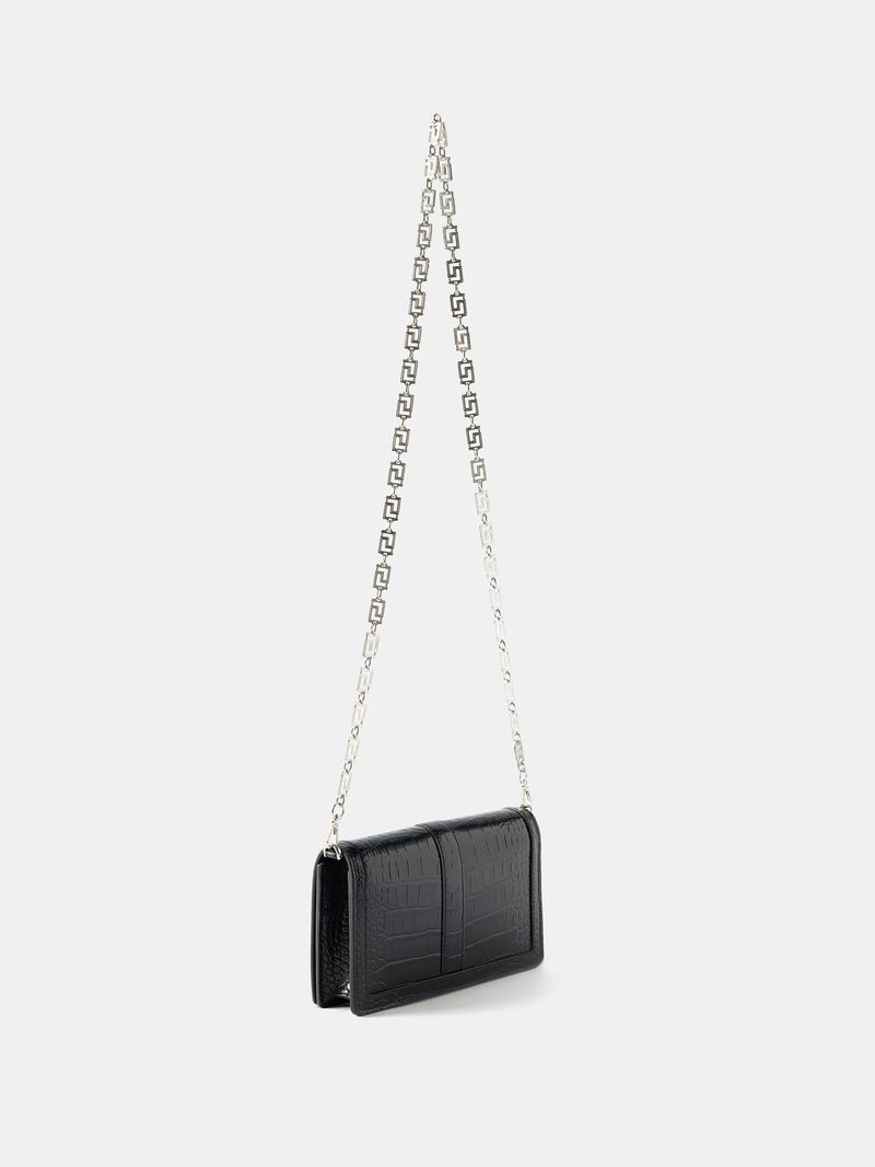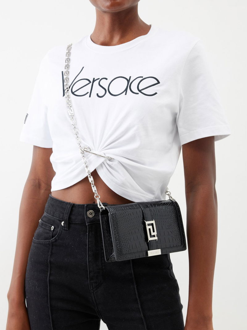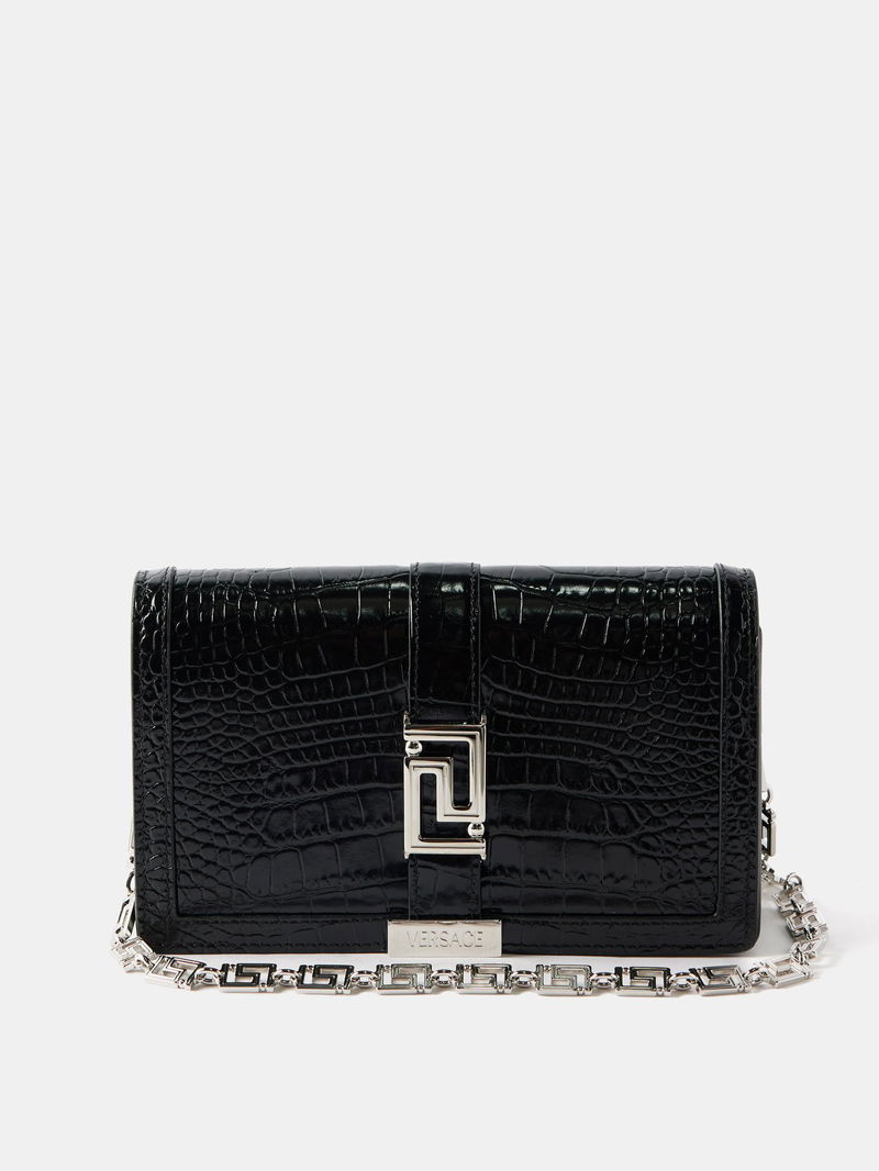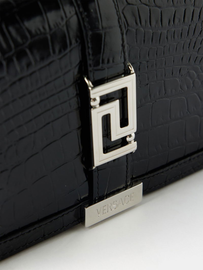 Crafted in crocodile-effect calfskin leather, Versace's Greca Goddess bag takes on miniature proportions for this structured black rendition, finished with silver hardware.