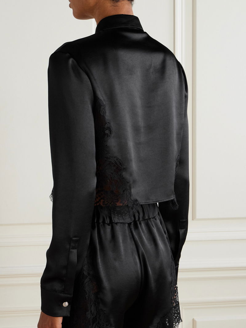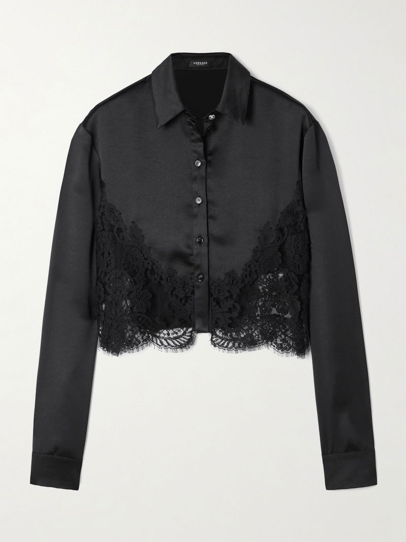 Versace's shirt is designed with sheer, scalloped lace along the cropped hem, giving it a romantic and alluring finish. It's made from lustrous satin and has a classic collar and buttoned cuffs featuring the 'Medusa' motif. Wear yours as a set with the coordinating shorts in our edit.