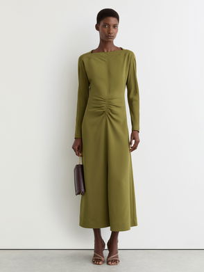 Versace's dress is cut from lustrous satin-jersey that molds to the body, creating a sculpted silhouette enhanced by artful ruching. The fluid fabric catches the light beautifully, while signature silver-tone medallions at the straps add unmistakable glamour.