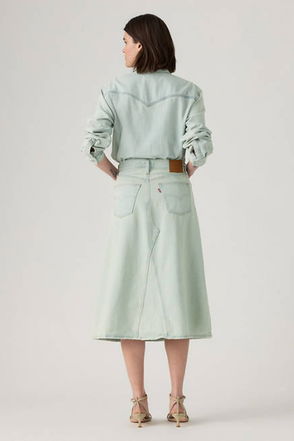 Vetements specialises in subtly off-kilter details like the asymmetrically placed belt loops on the back of this navy pinstriped skirt. It's crafted from crepe with a high-rise waist and a deep hemline slit for freer movement. Offset the polished silhouette with a logo-print T-shirt.