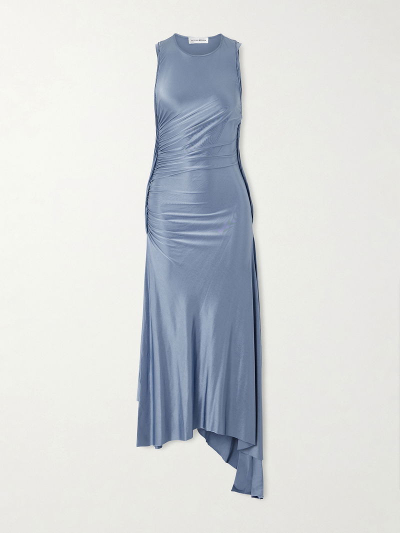 Victoria Beckham's midi dress is artfully twisted and gathered, cinching the fitted silhouette and highlighting the slinky satin-jersey.