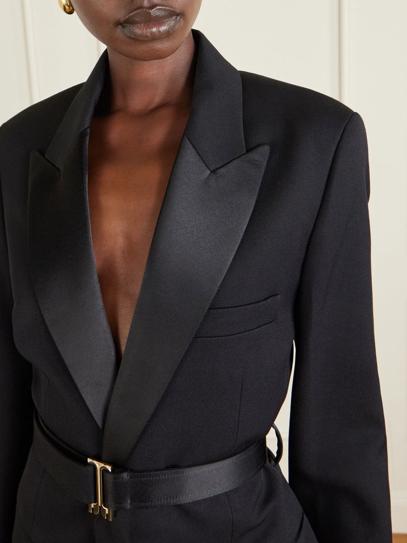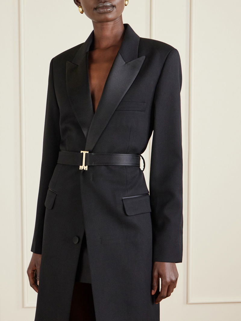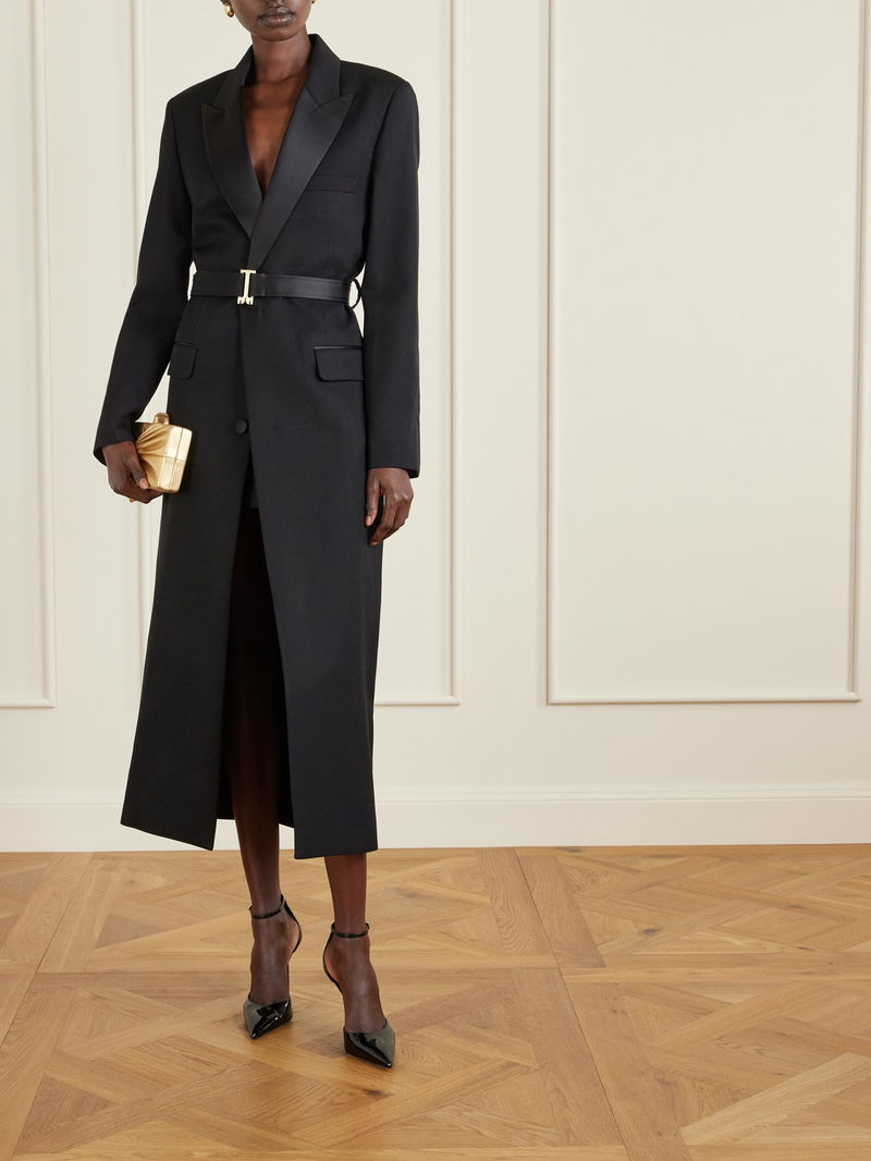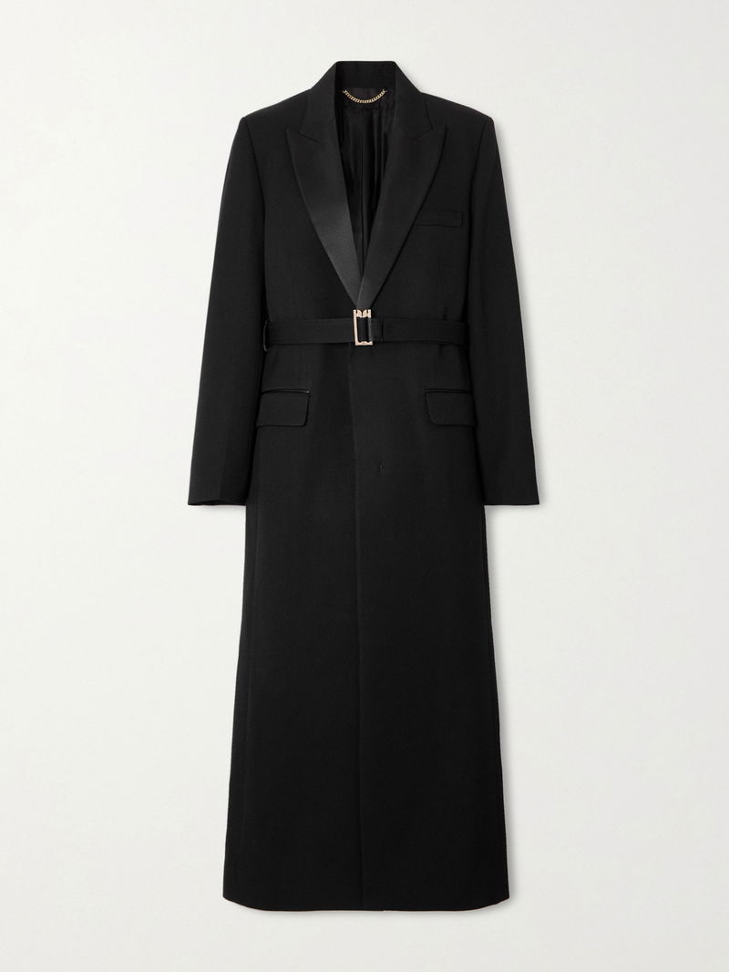 Victoria Beckham’s coat nods to classic tuxedo tailoring with its sleek satin lapels and structured silhouette. Cut from smooth twill in a longline, single-breasted shape, it comes with a glossy belt featuring the label’s signature ‘B’-shaped buckle. Wear it over evening looks or sharp tailoring.
