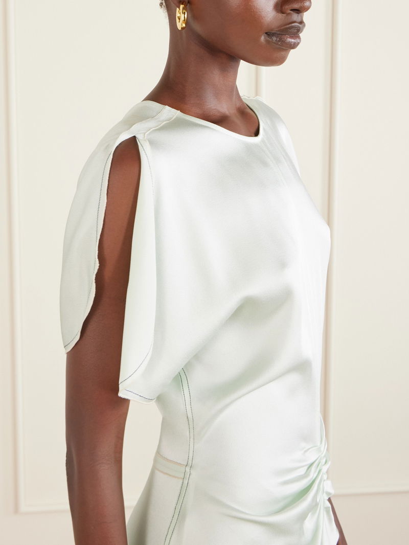 Victoria Beckham's mini dress is intricately gathered along the hips to create pretty draping. Accessorize with heels and a clutch for special occasions.