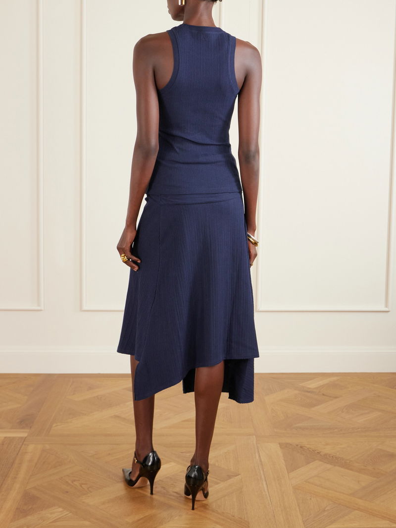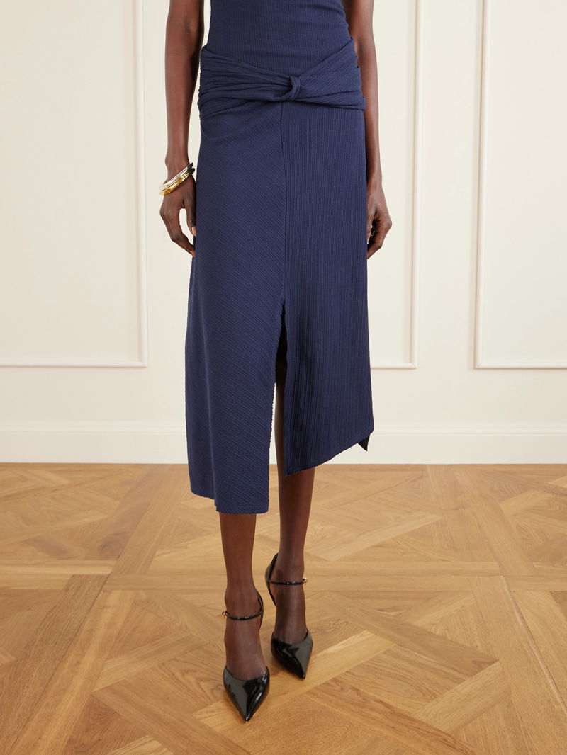 Victoria Beckham's skirt will lend your look sculptural interest. It's made from organic-cotton crepon with a hint of stretch and a knotted waist and falls to an asymmetric midi hem. Wear yours with the coordinating tank and mules.