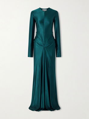 Description: Victoria Beckham's gown is the epitome of understated glamour. Made from stretchy satin-jersey in a pretty storm-blue, it's artfully ruched through the bodice and back hip to accentuate your curves. Complement the knuckle-grazing sleeves with stacked rings. - Net a Porter Materials: 90% polyester, 10% elastane Product Code: 1647597338669872