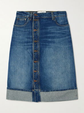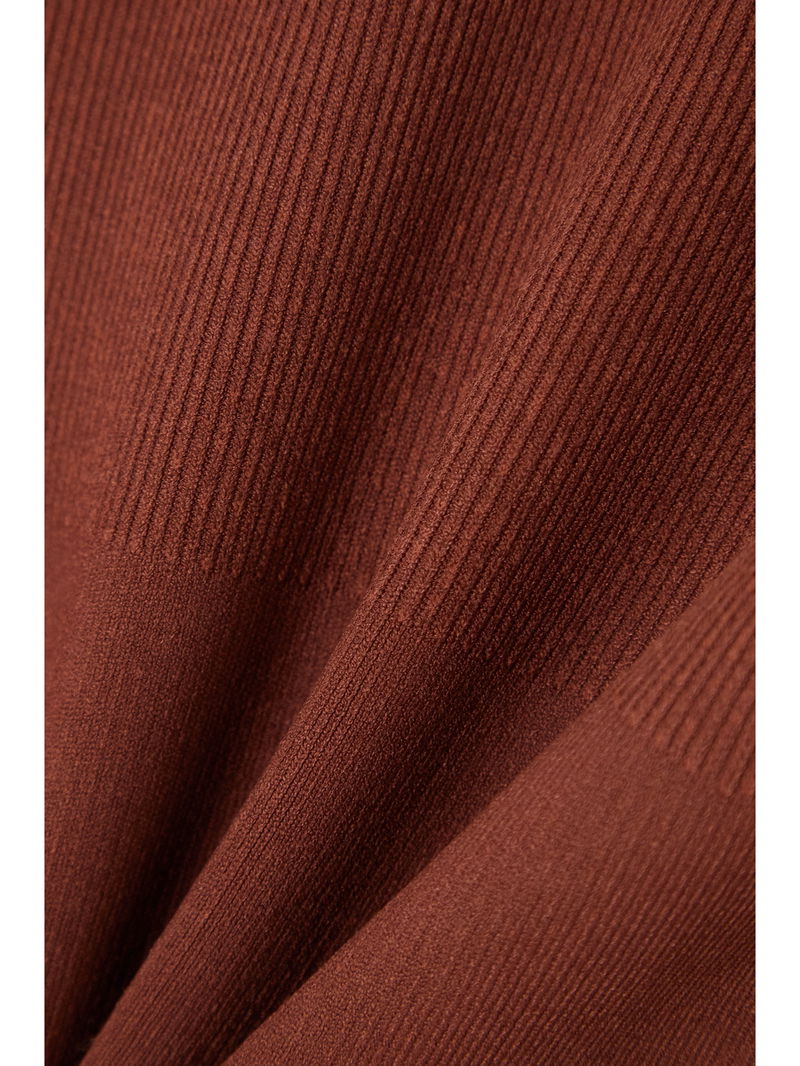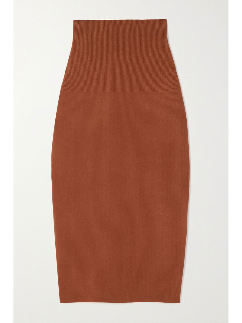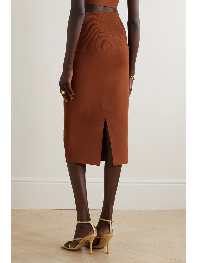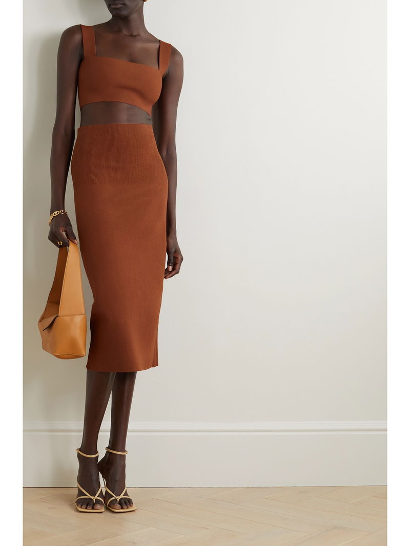 "The entirety of the collection is made from a bespoke knitted jersey," says Creative Director Victoria Beckham of the 'VB Body' capsule, adding that each piece has just the right amount of stretch. Ribbed at the top, this brown skirt will subtly sculpt your silhouette. Its midi length will work with so many different shoes.