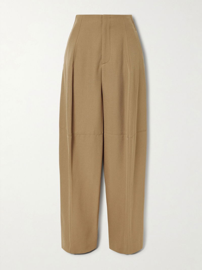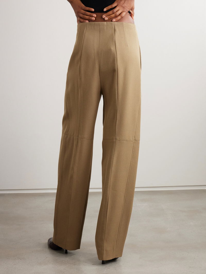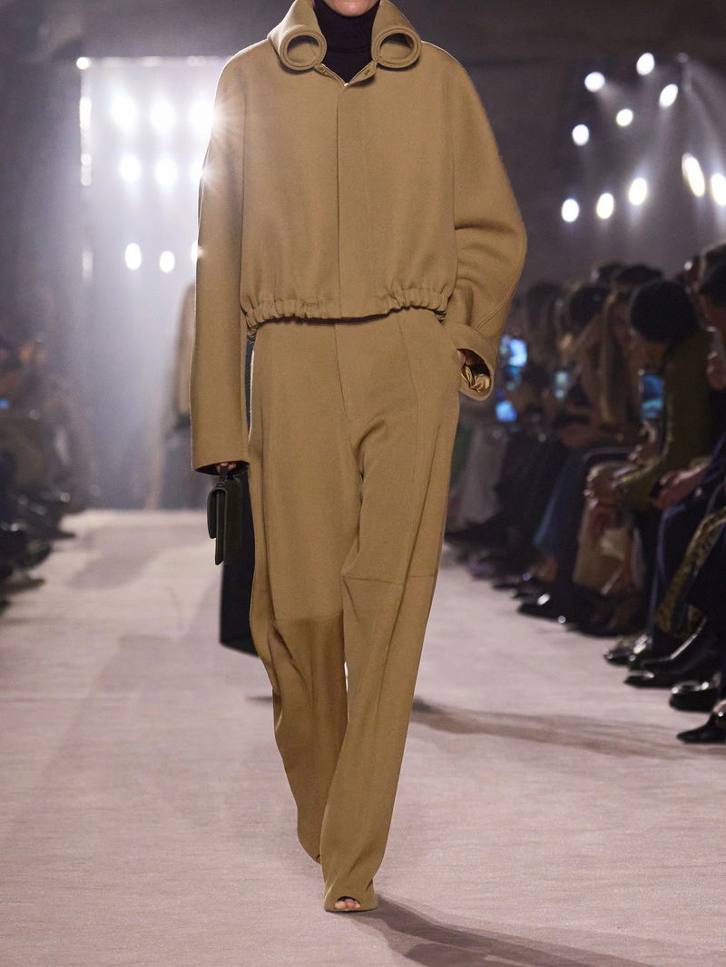 Victoria Beckham's pants are tailored in a wide-leg profile from structured wool-drill, which holds its shape beautifully. They debuted on the Fall '25 runway, styled with the coordinating bomber jacket.
