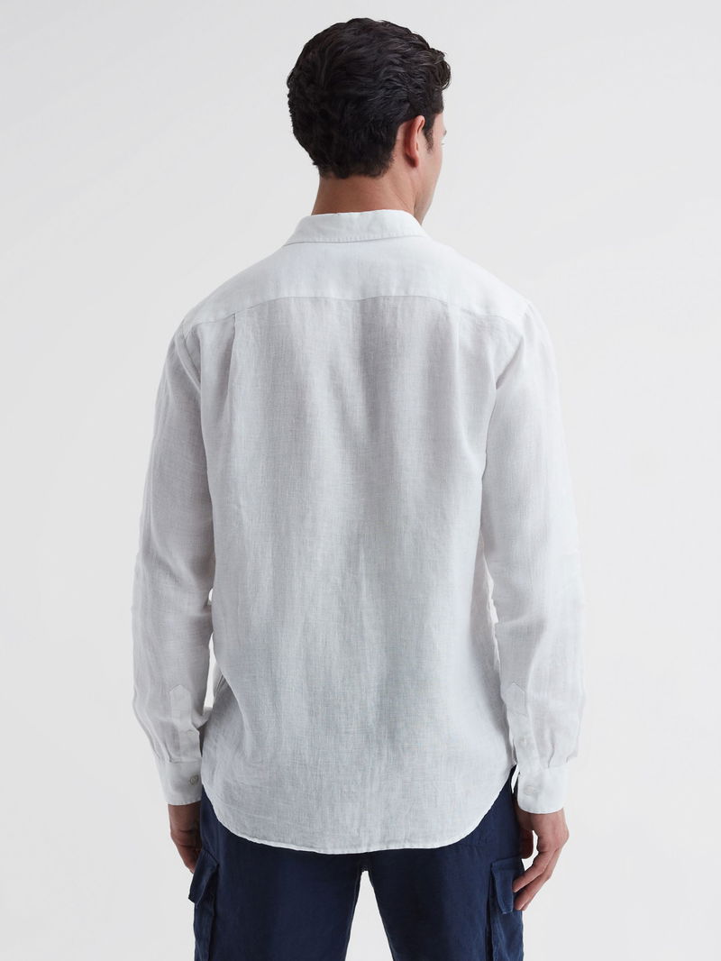 The Caroubis linen shirt in pale blue is a lightweight styling saviour designed with vacations in mind. Its traditionally formal shape lends sophisticated appeal, whilst still being a versatile option. An embroidered motif is added to the hem as an understated style note. Wear unbuttoned with your favourite swim shorts. Or, get ultimate style mileage by pairing with formal separates.