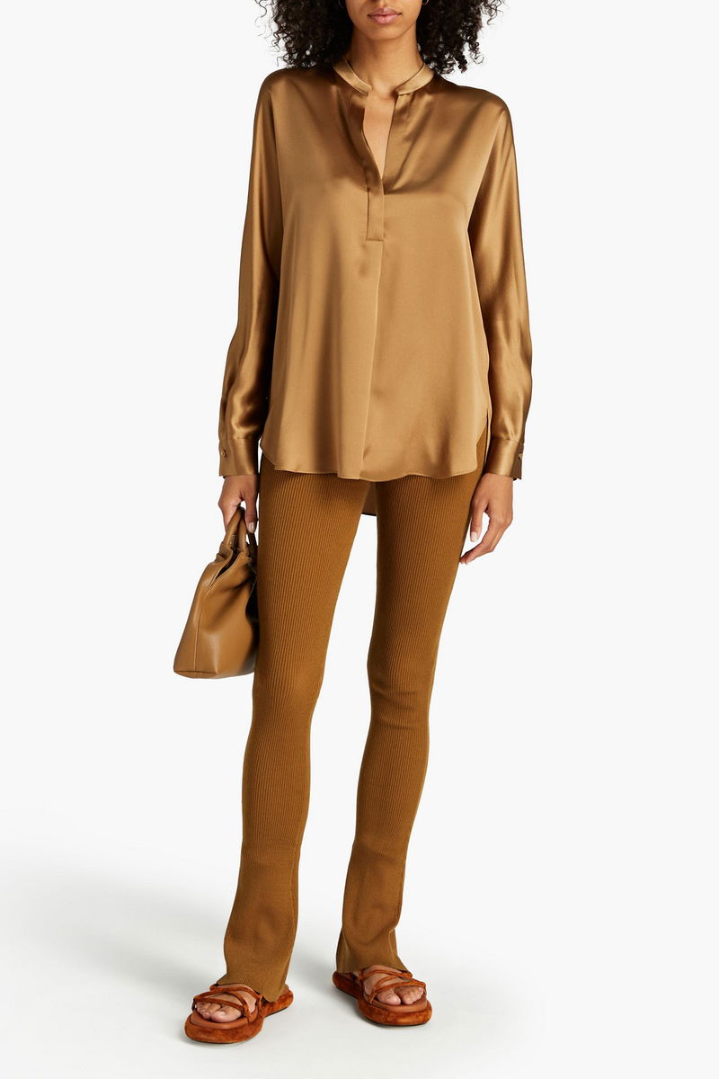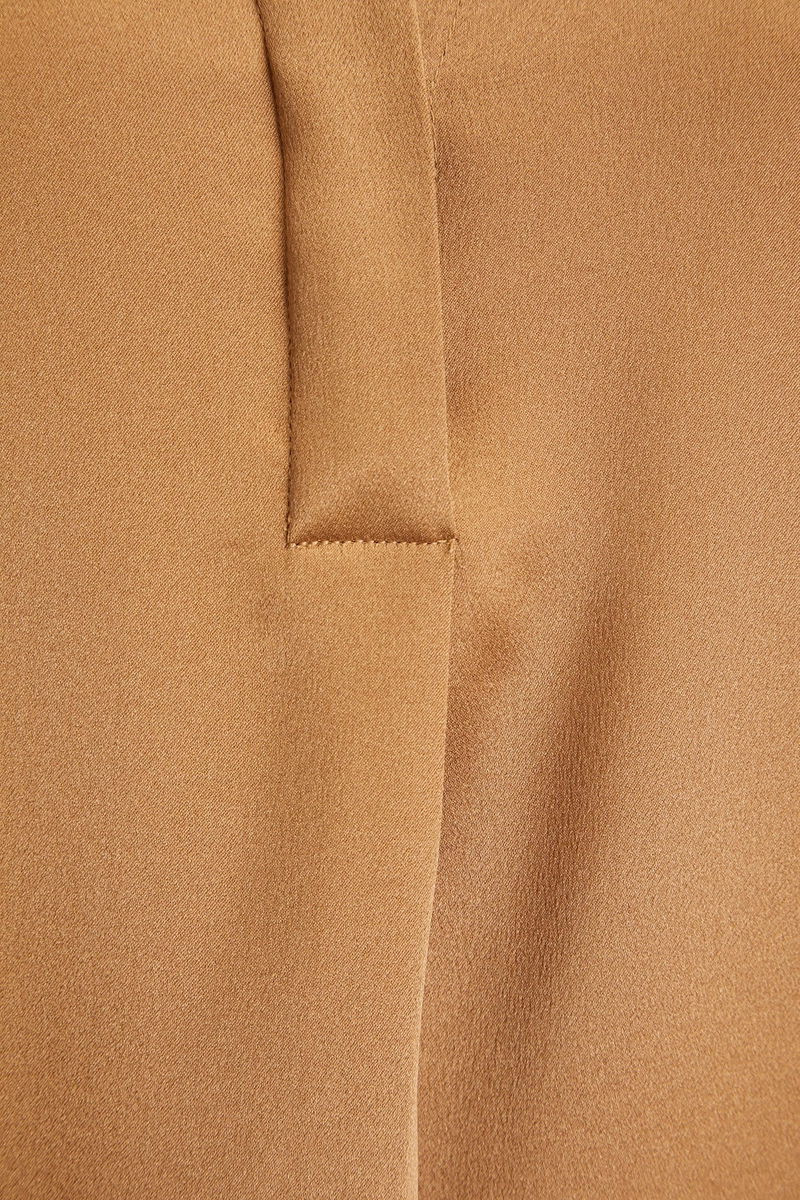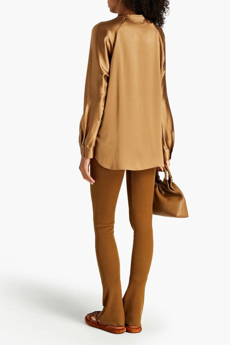 Blouse. Silk-satin. Pleated detailing. Buttoned cuffs. Curved hem. Concealed button fastenings along front. Non-stretchy fabric. Mid-weight fabric.