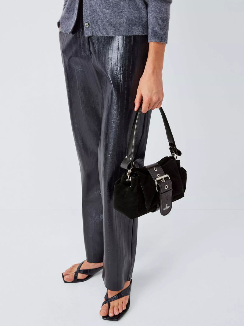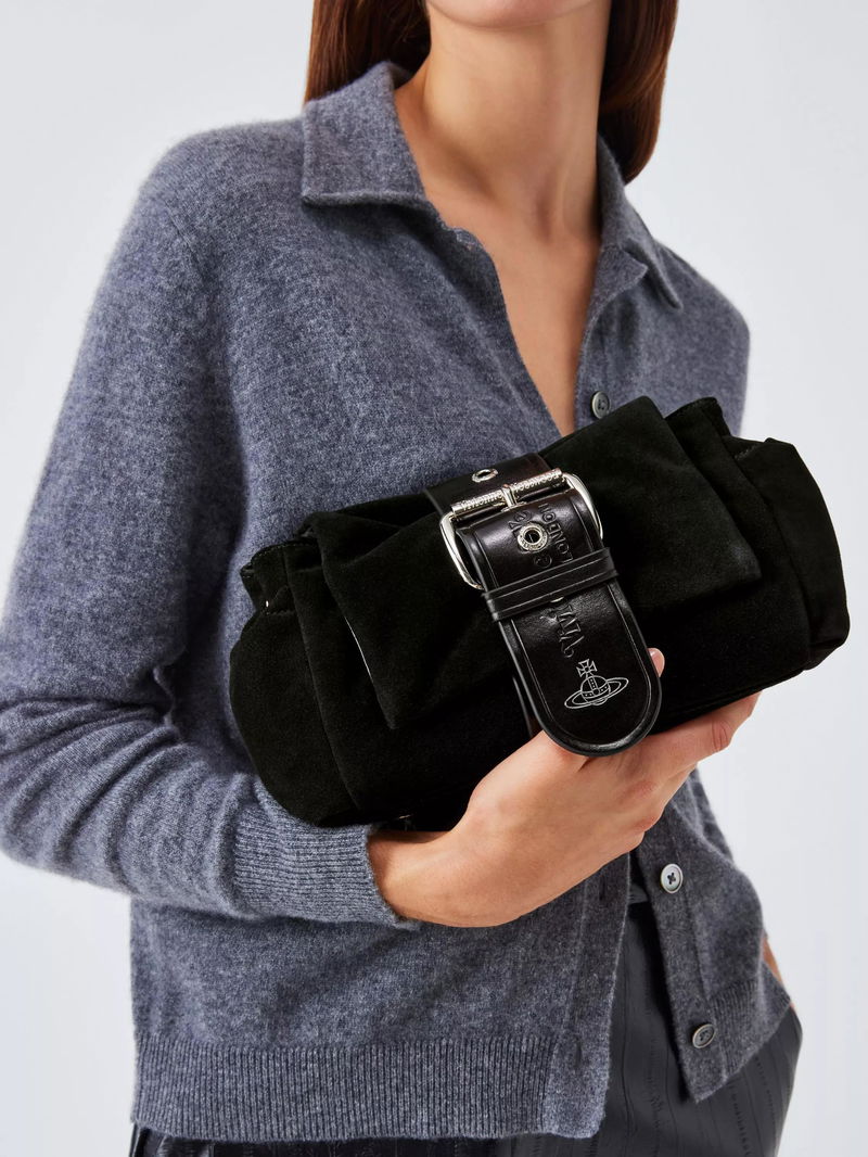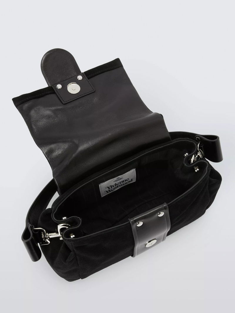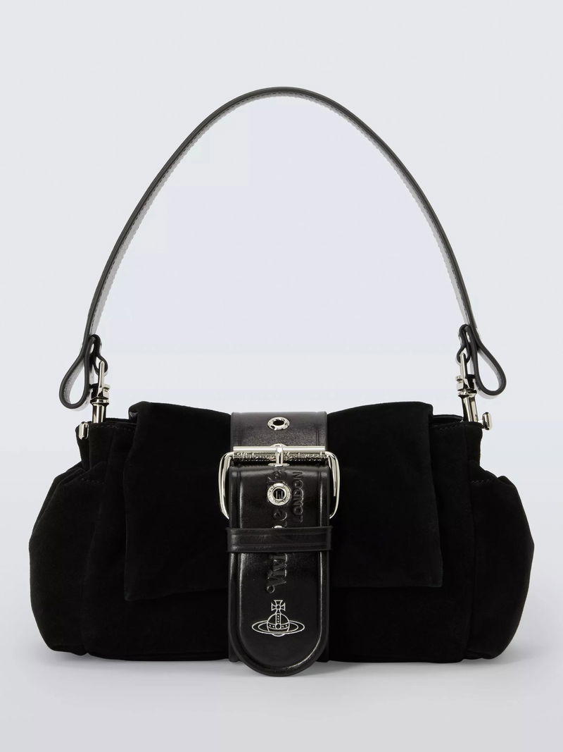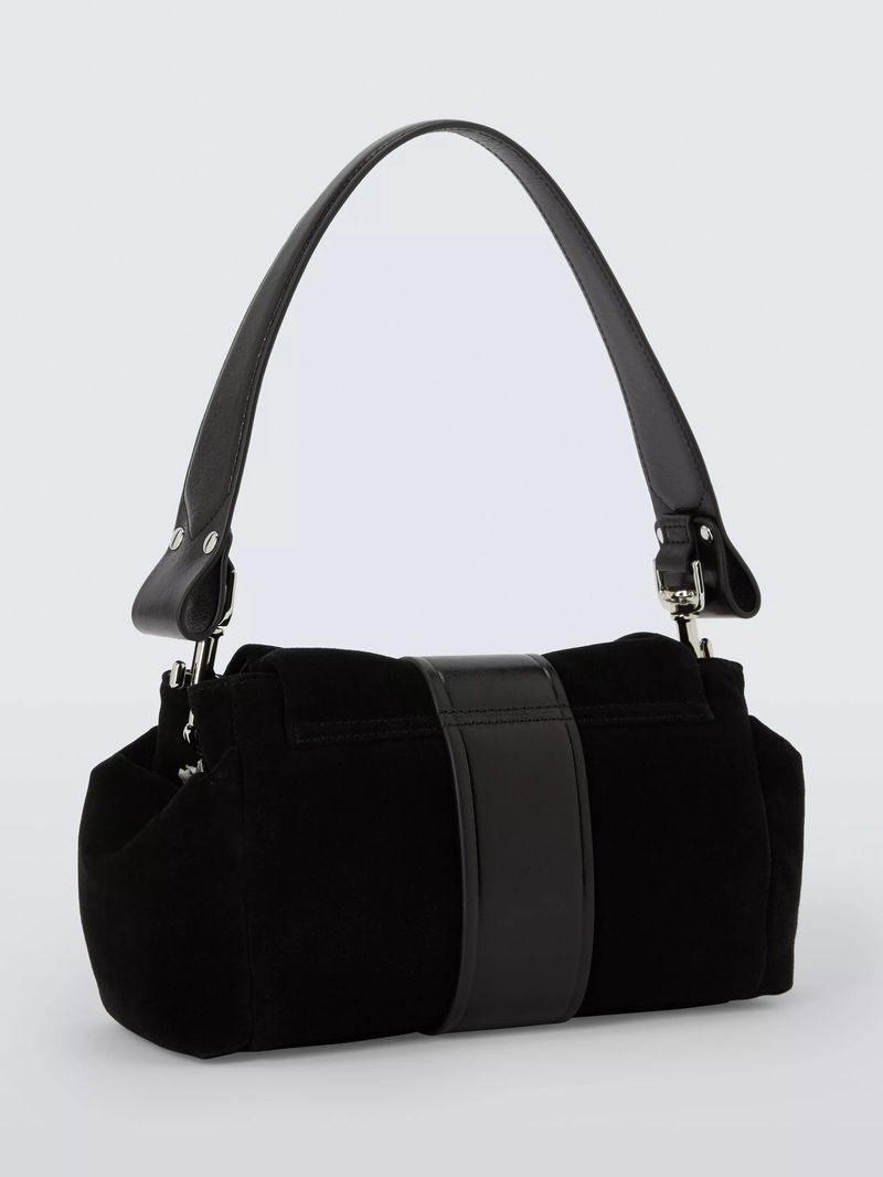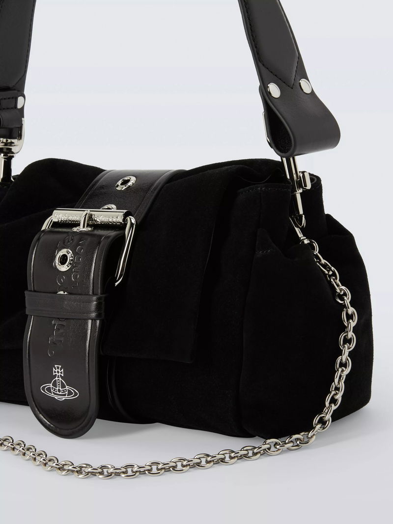 This suede shoulder bag features the brand's iconic orb symbol, magnetic closure, lined interior and chain strap for easy, practical style every day.