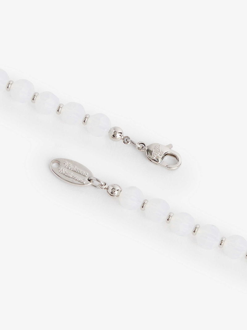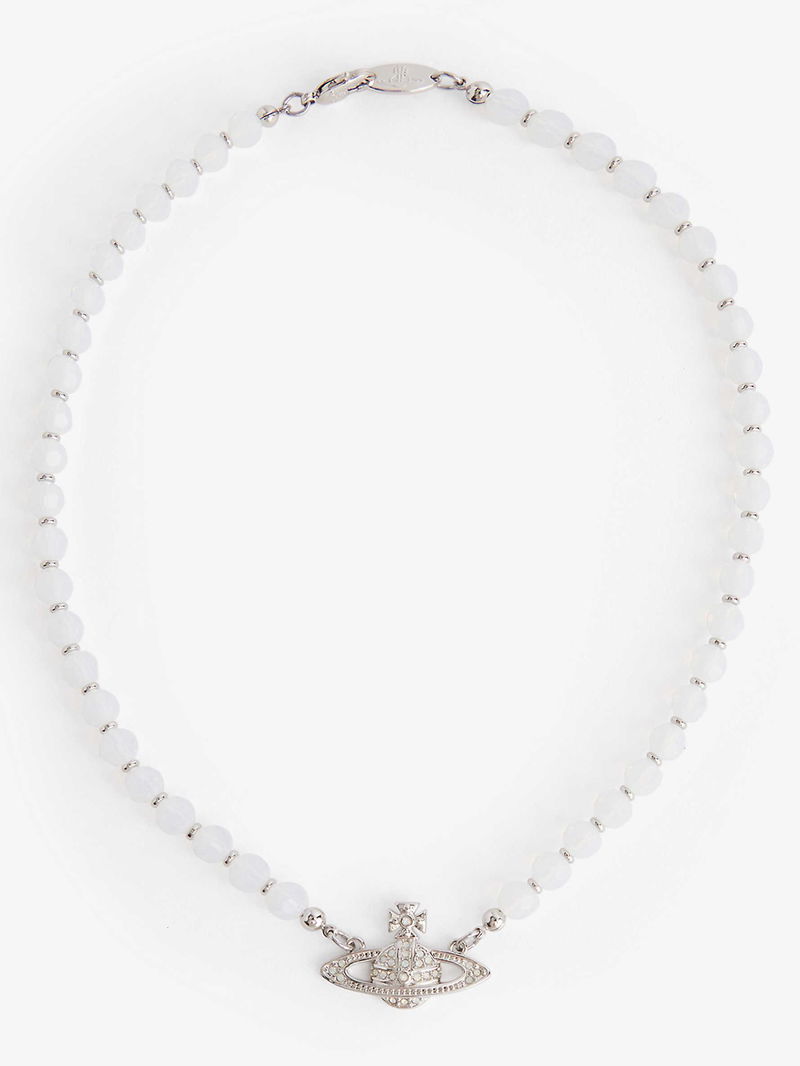 True to its rebellious spirit, Vivienne Westwood subverted the aesthetics of Britain's upper echelon when debuting the Bas Relief necklace in her AW87 collection. Today, you can see a reinterpretation of the iconic design front and centre on the irresistible Messaline choker. The silver-tone brass orb pendant is suspended from a string of shimmering crystals that catch the light and sparkle from all angles.