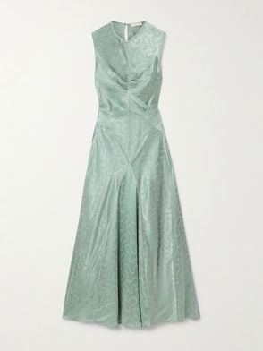 Opt for satin when you want to give off an air of easy sophistication. In a vintage tea silhouette, this midi dress features puffed sleeves and a jacquard finish.