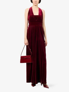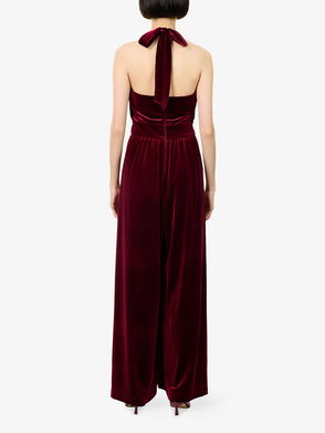 Hand-drawn by Shrimps founder Hannah Weiland, this silky jumpsuit has a halter neck, open back and green piping.