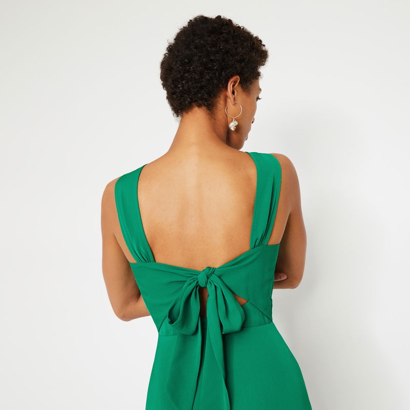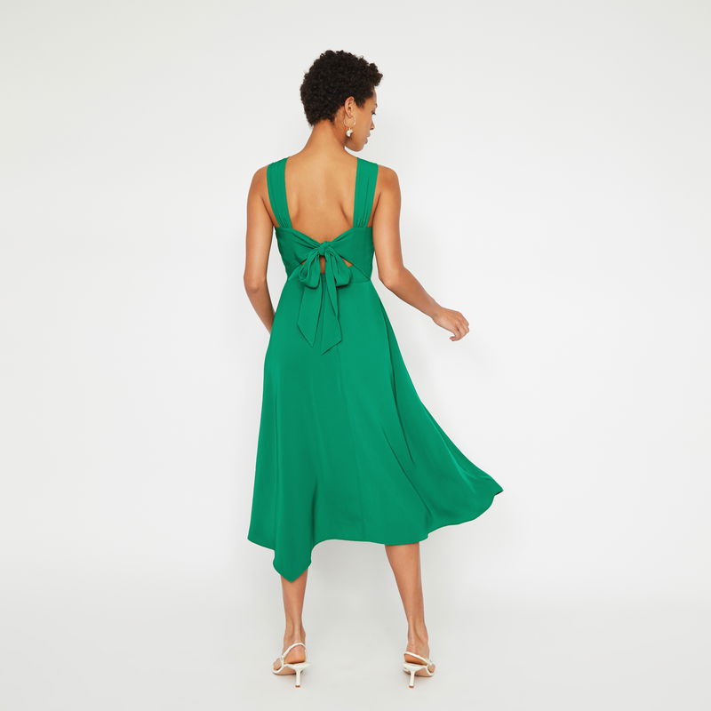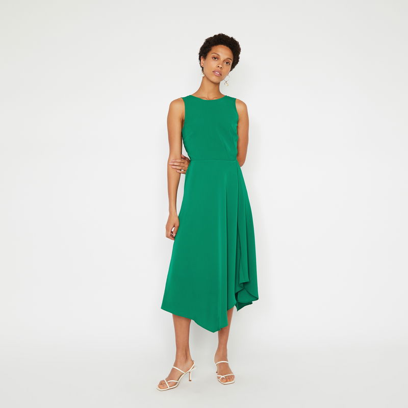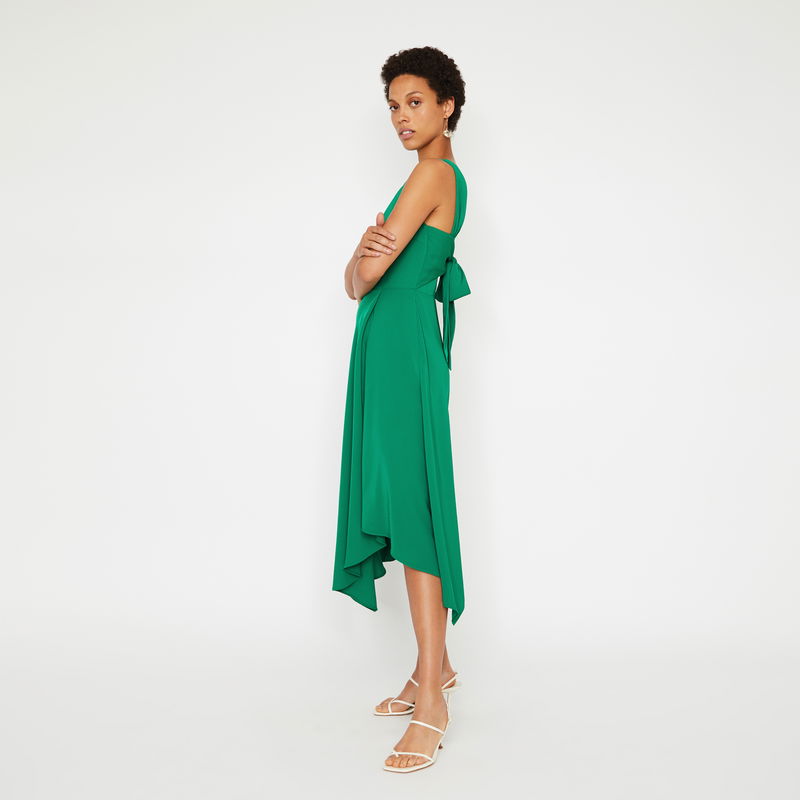 Show your back. Laid back tailoring with a special twist, turn around you'll see. Featuring a high neck and asymmetric hem, this midi dress was made for rooftop mingling.