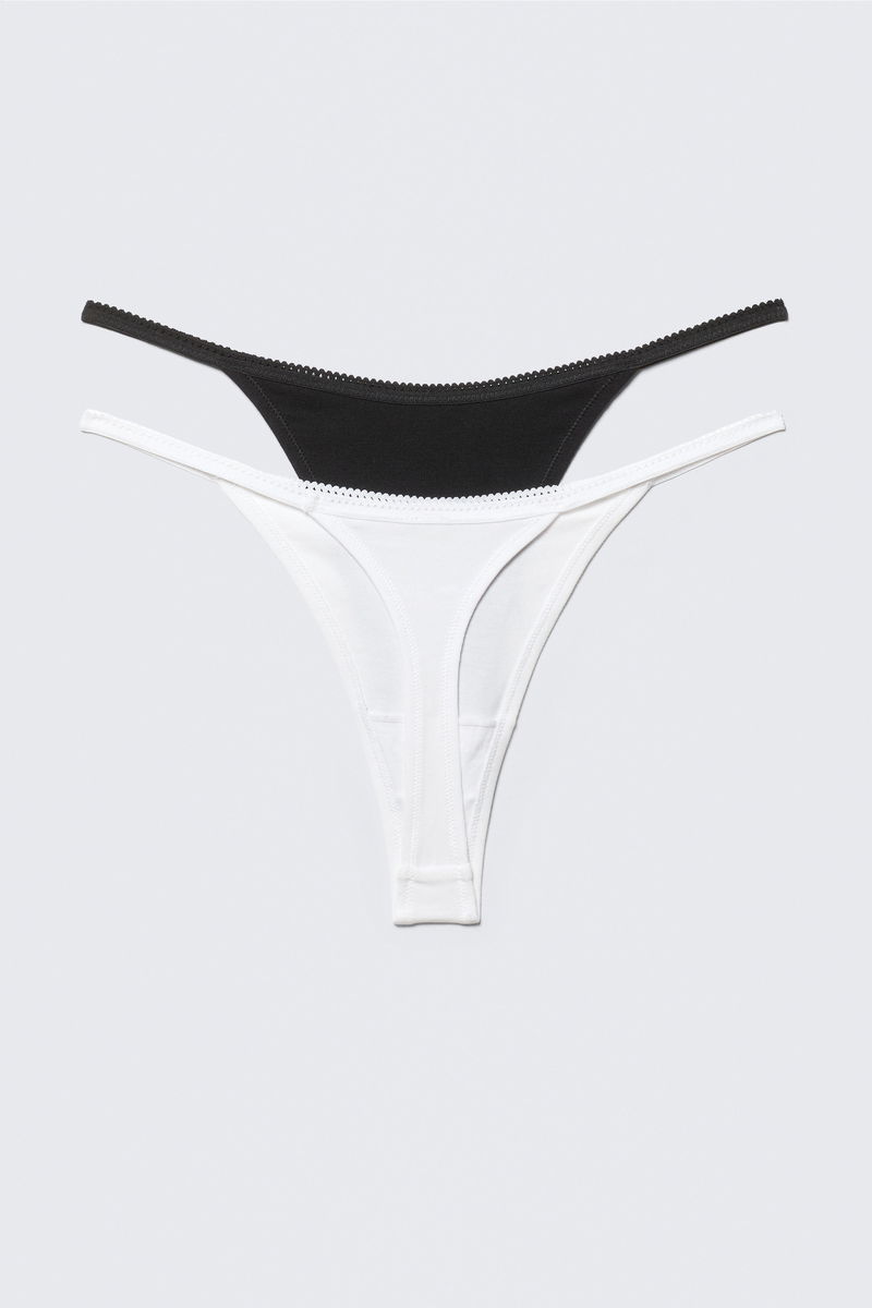 A two-pack of tanga thongs crafted from stretchy cotton. Designed with a picot elastic waistband and a cotton-lined gusset for added comfort.