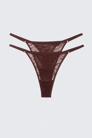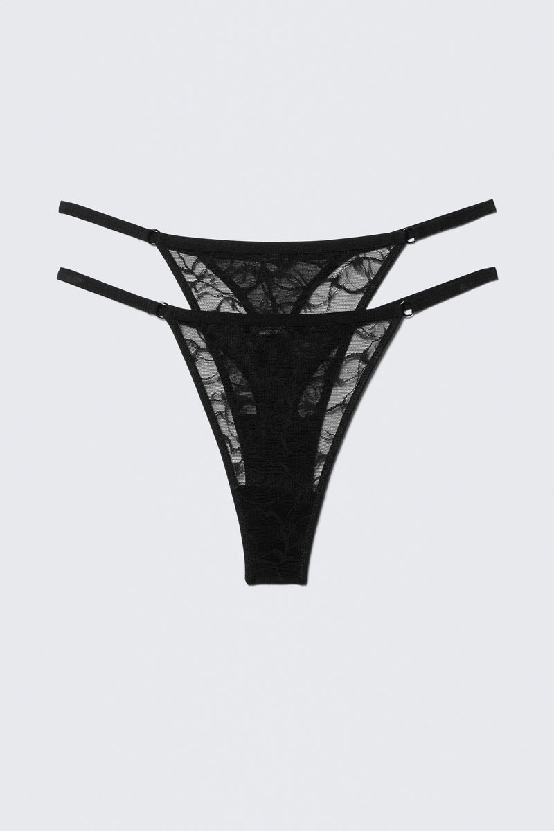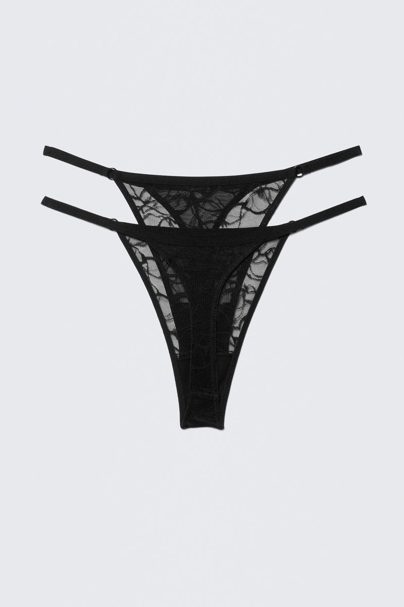 A 2-pack of tanga thongs crafted from delicate swirly lace with a sheer finish. Designed with slim elastic side straps connected by small rings for a sleek look. It features a cotton-lined gusset for comfort and a mid-rise waistline.
