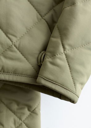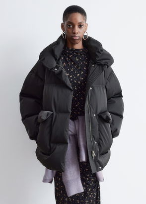 A go-to puffer jacket with made from recycled polyester. This winter classic five quilted sections on the body and four on the arms, it has side slit pockets, and detachable arms and hood with a face-covering front flap.